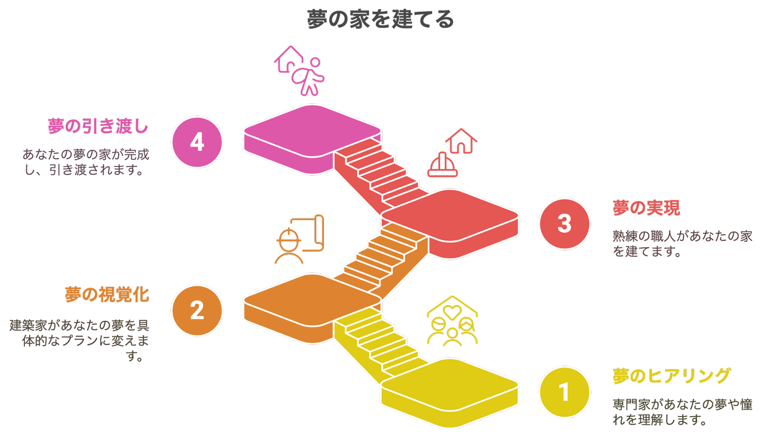 ここでは、お客様との出会いから、夢がカタチになり、そして未来へと続いていくまでの旅路を、順を追ってご紹介します。