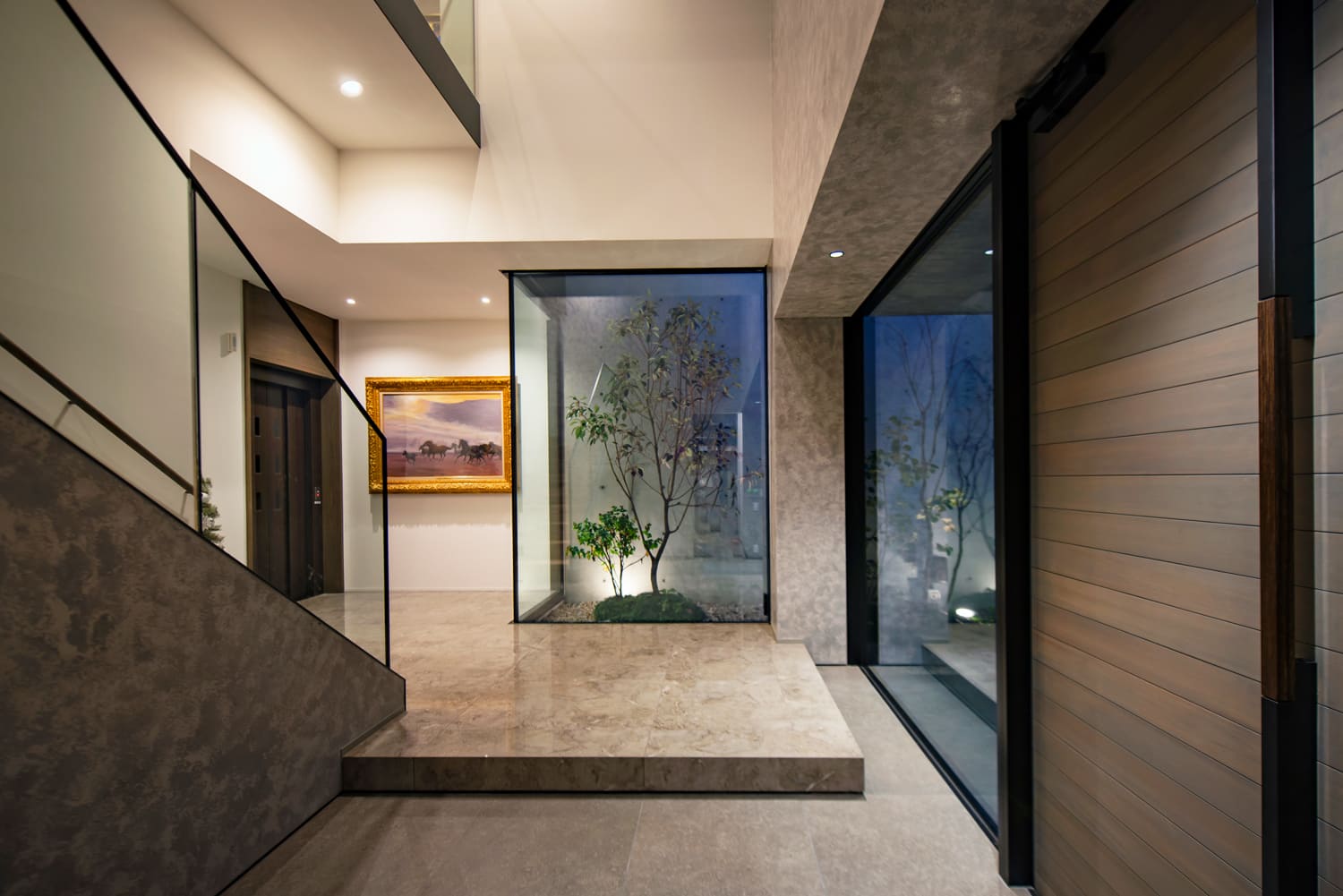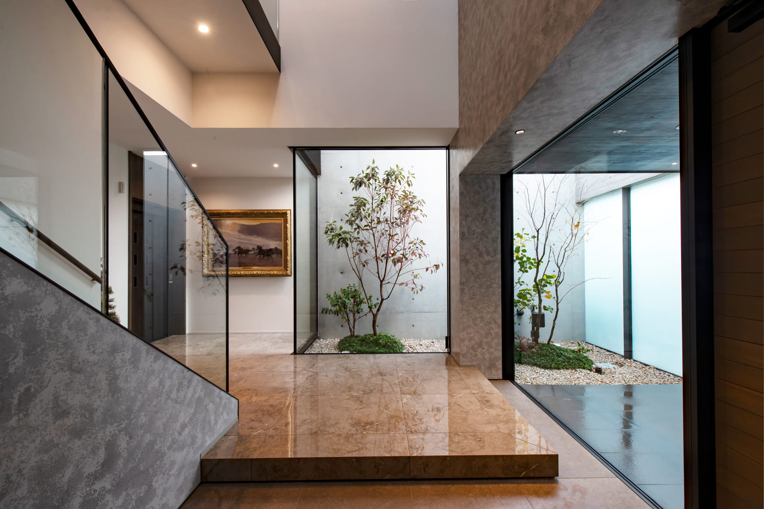 アプローチ・中庭】内に開かれた、我が家だけの「オアシス」。光と緑が、心を解き放つ場所