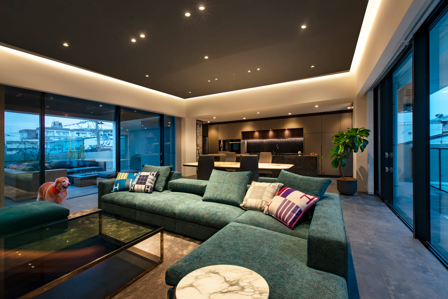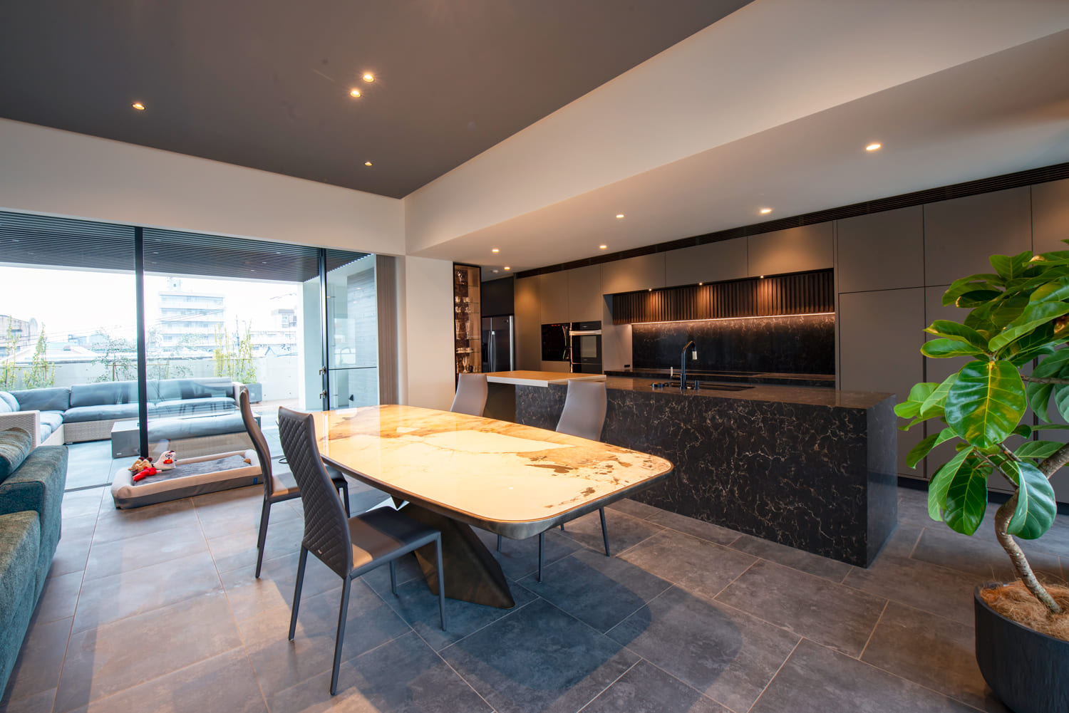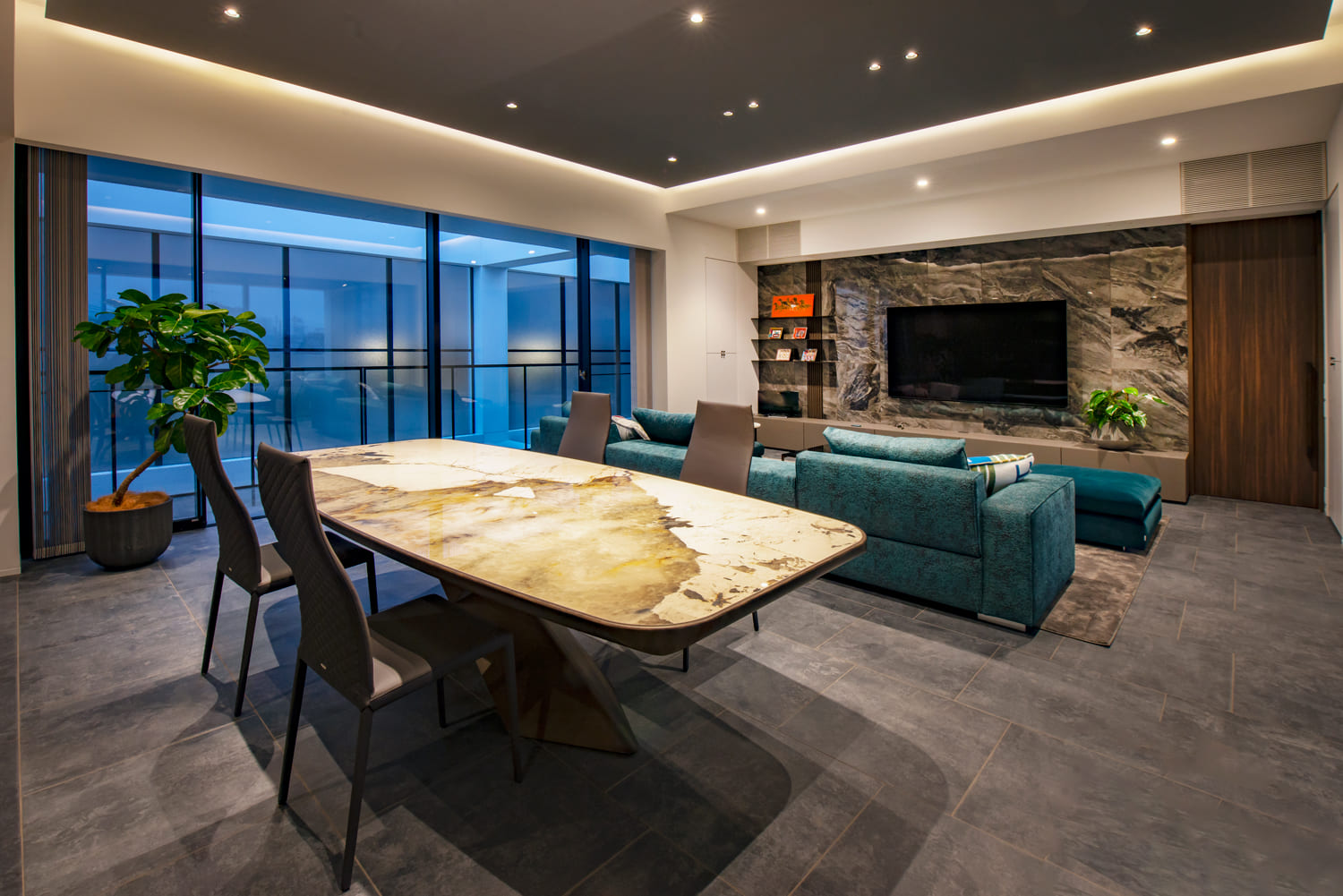 リビング・ダイニング】夜景という名の、巨大なアート。石と光が織りなす、至高のくつろぎ空間