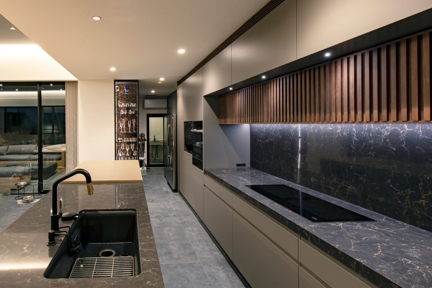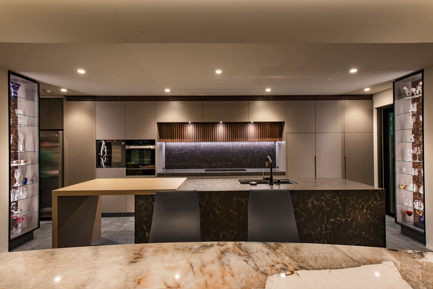 壁にあしらわれた重厚な石の素材感と、天井に巡らせた柔らかな間接照明が共鳴し、まるで高級ホテルの最上階スイートのような、圧倒的な非日常感と、深い安らぎを同時に実現しています。