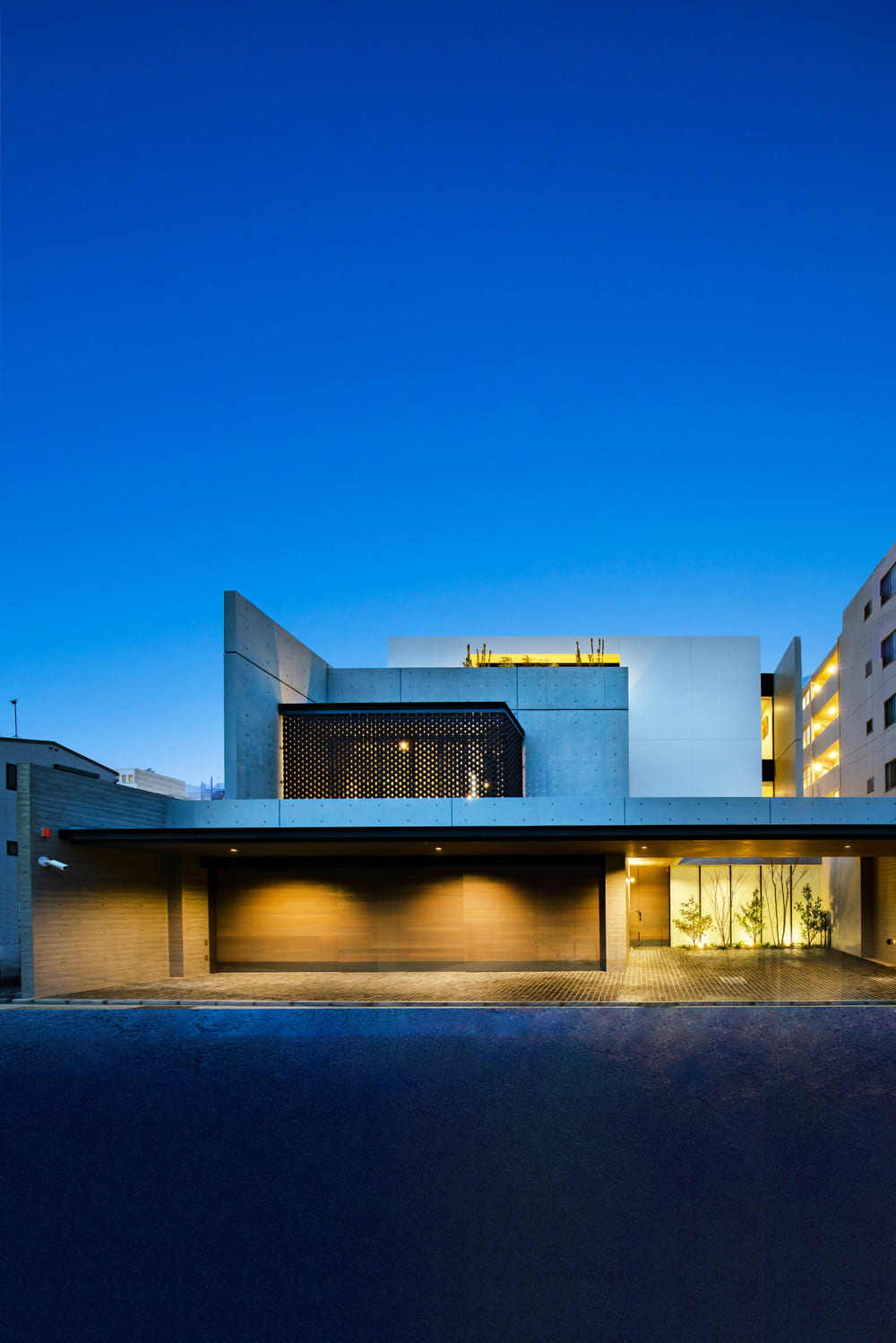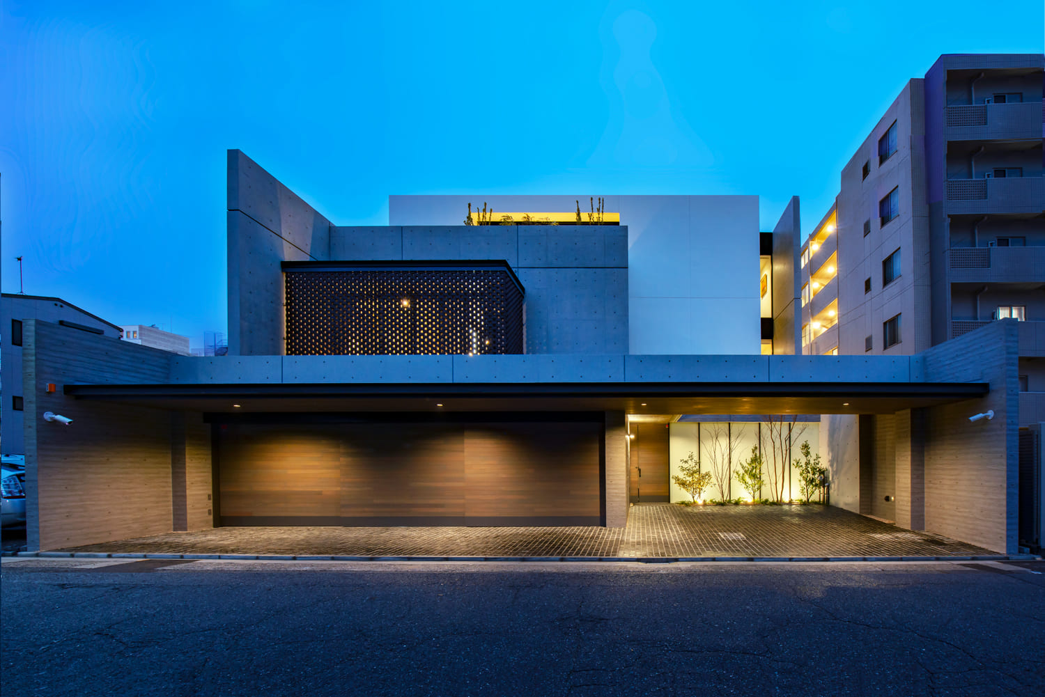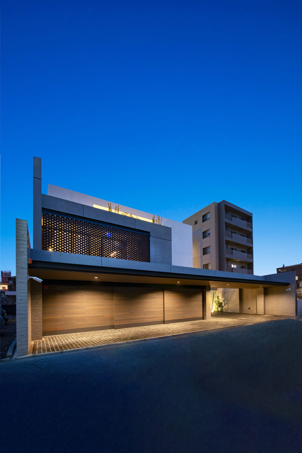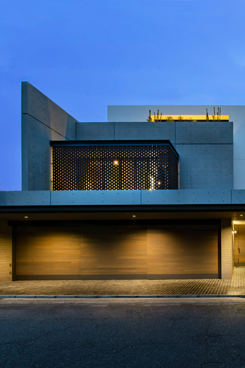 無機質に見えがちな素材も、リズミカルな配置と夜の美しいライティングによって、まるで現代アートの彫刻のような、威厳と品格のある「邸宅の顔」となります。
