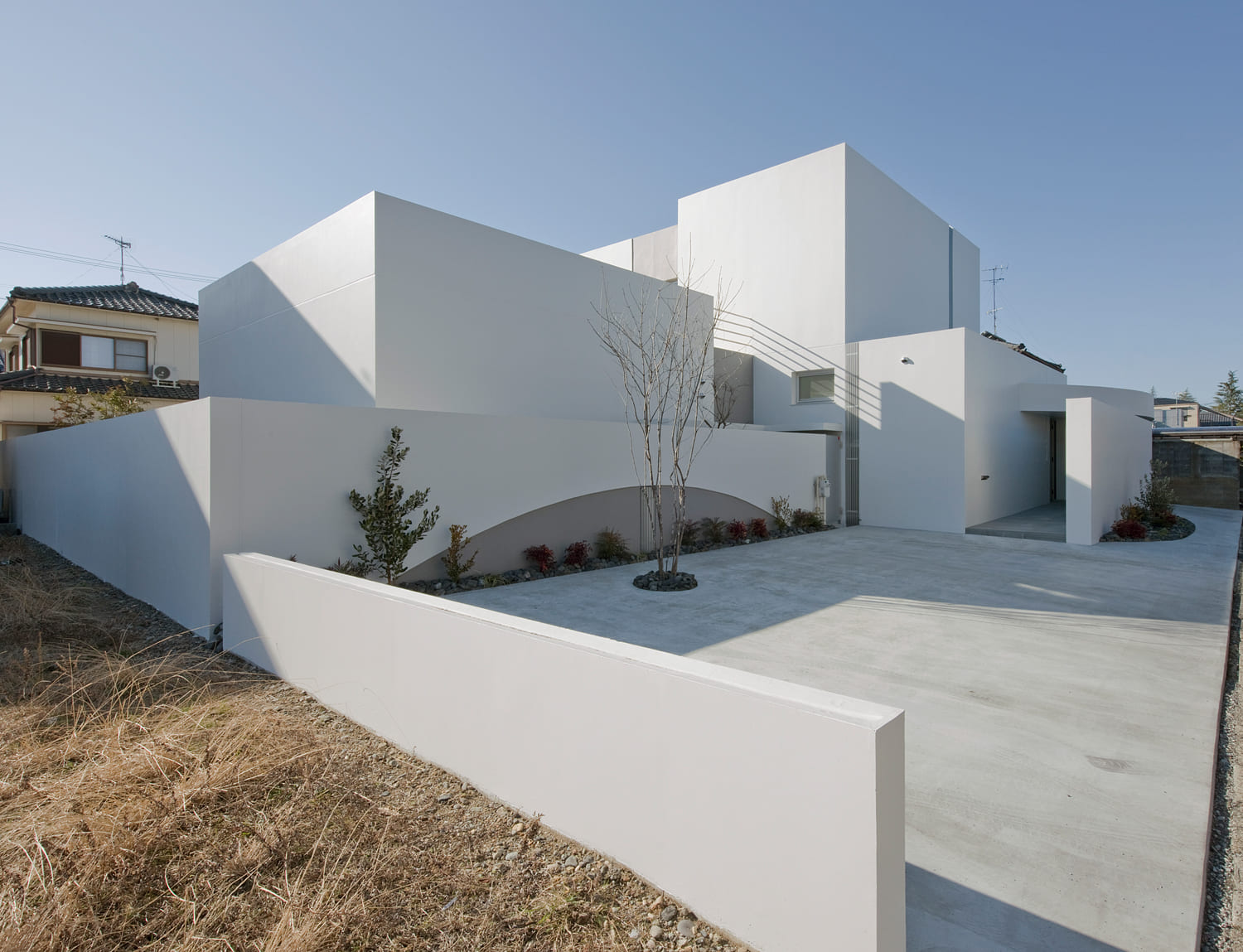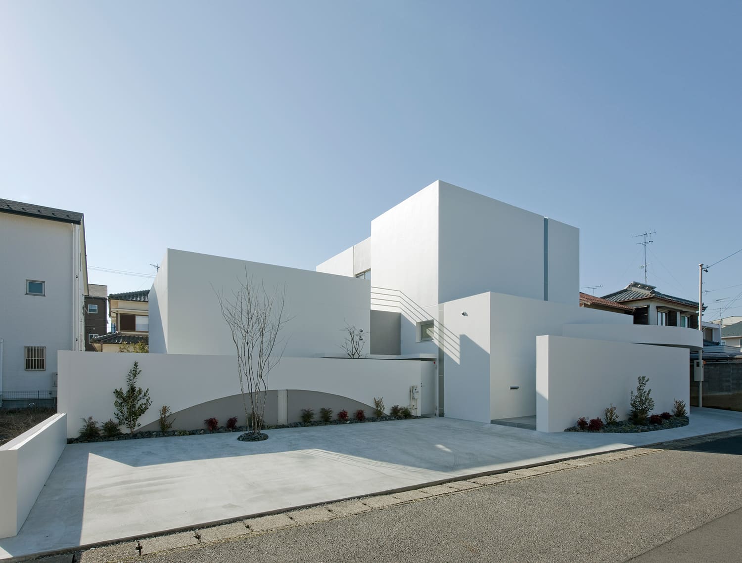 リズミカルに組み合わされた、真っ白な箱と、優雅な曲線を描く壁。