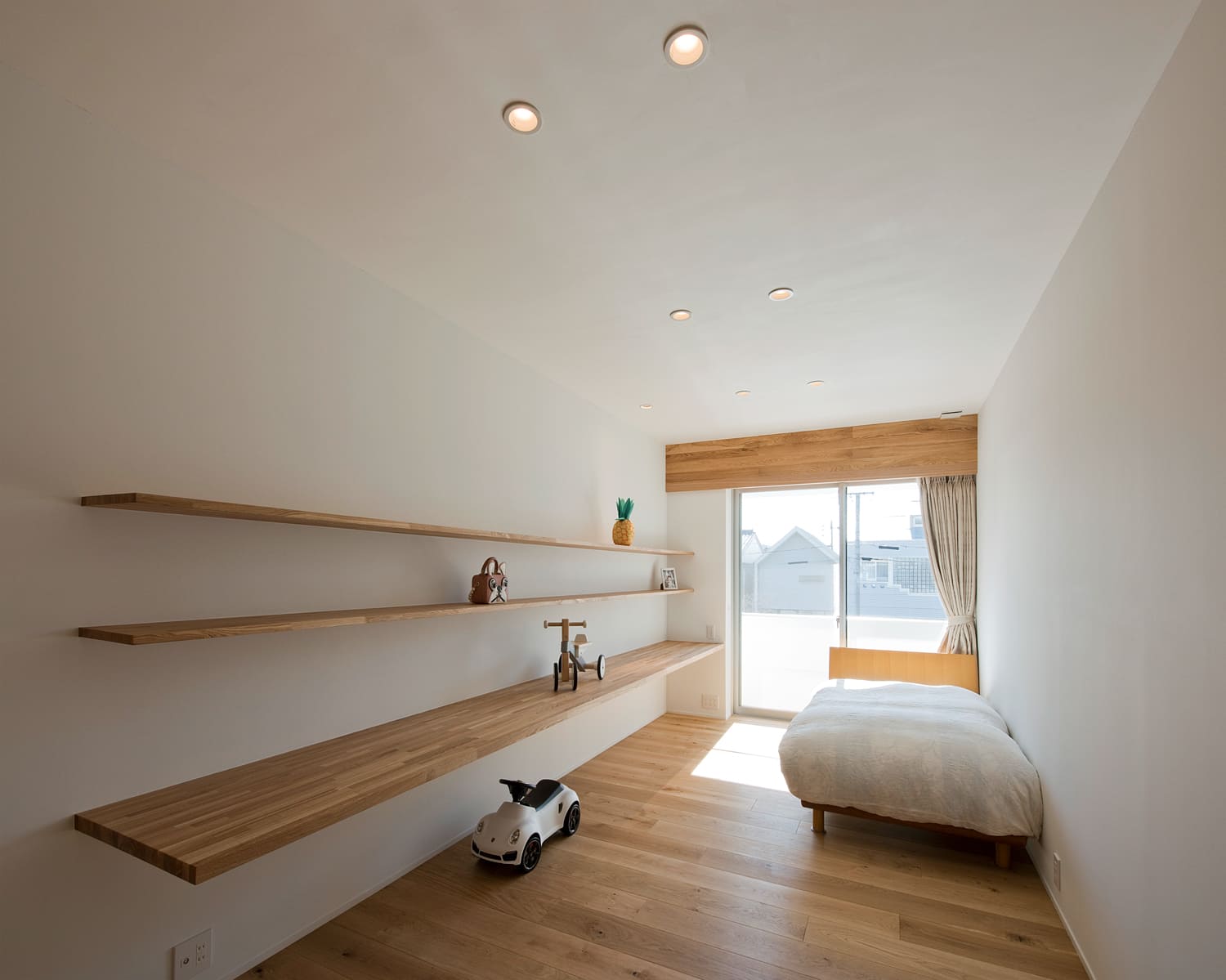 大きな窓からはたっぷりと光が差し込み、壁に設えた造作の棚には、好きな本や小物を飾ることができます。