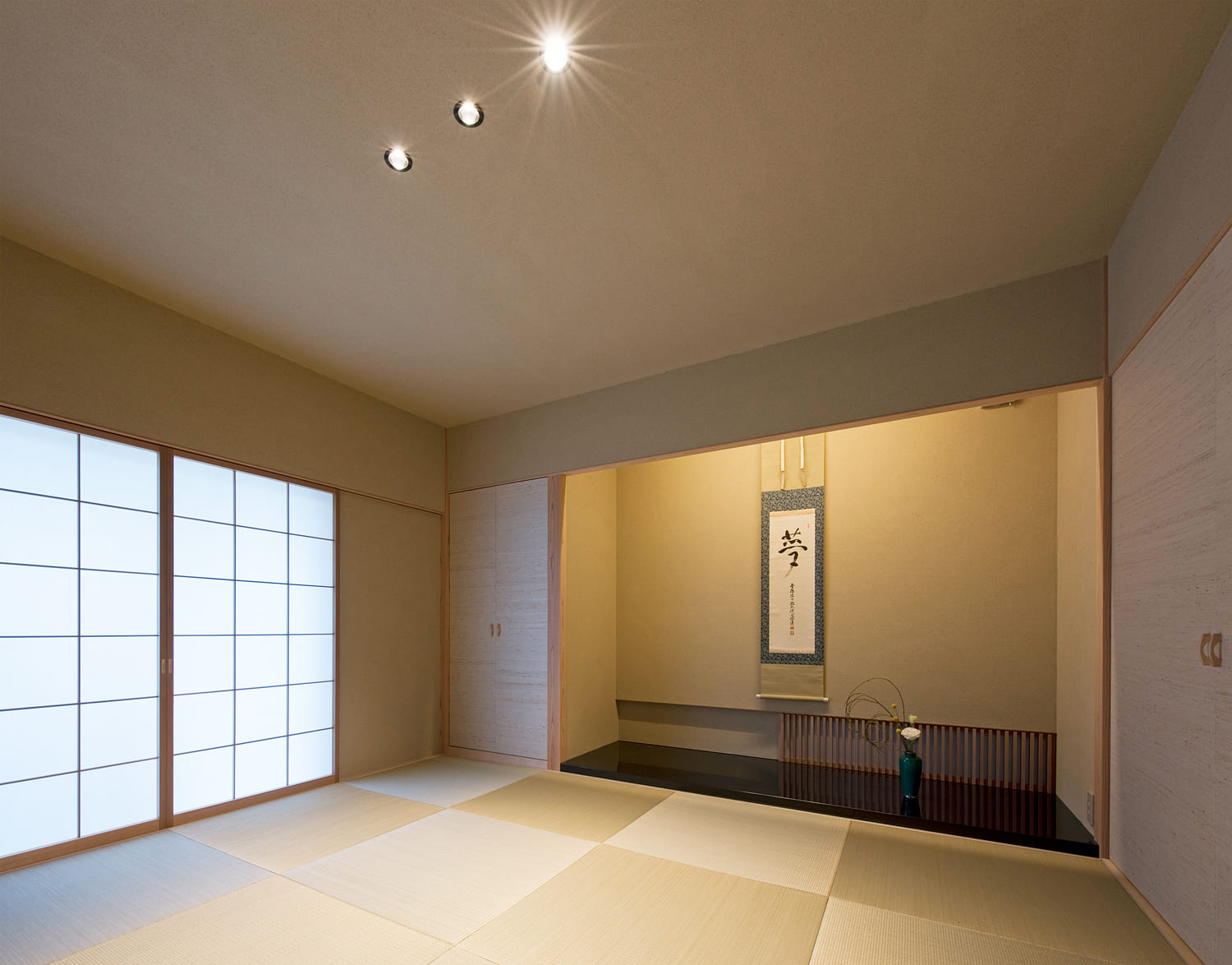 モダンで真っ白な空間の中に、静かに設けられた、本格的な和室。床の間をしつらえ、琉球畳を敷き詰めたこの場所は、凛とした空気が流れる、特別な空間です。