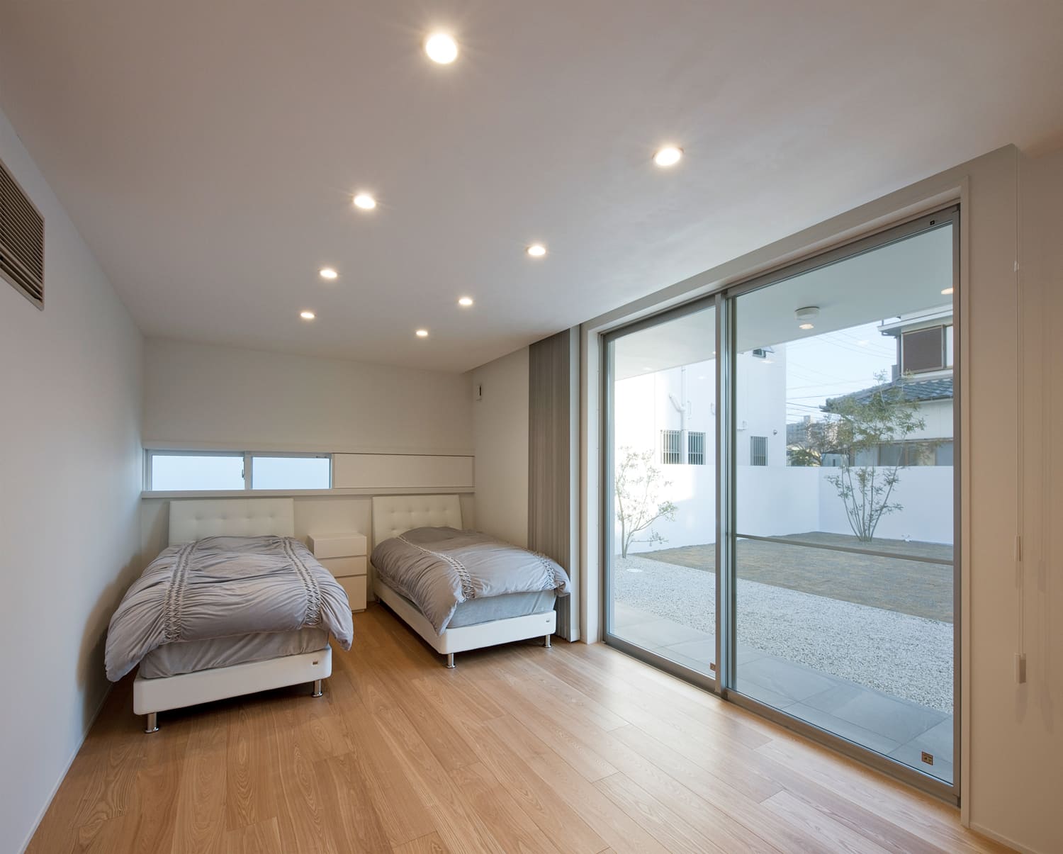 白を基調としたパブリックスペースとは対照的に、寝室は温かみのある木のフローリングを採用。