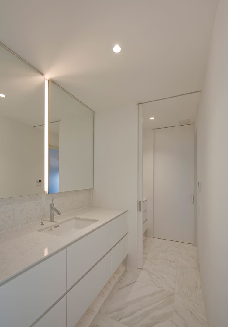 ミニマルなデザインで統一された、ホテルのように上質な洗面台。