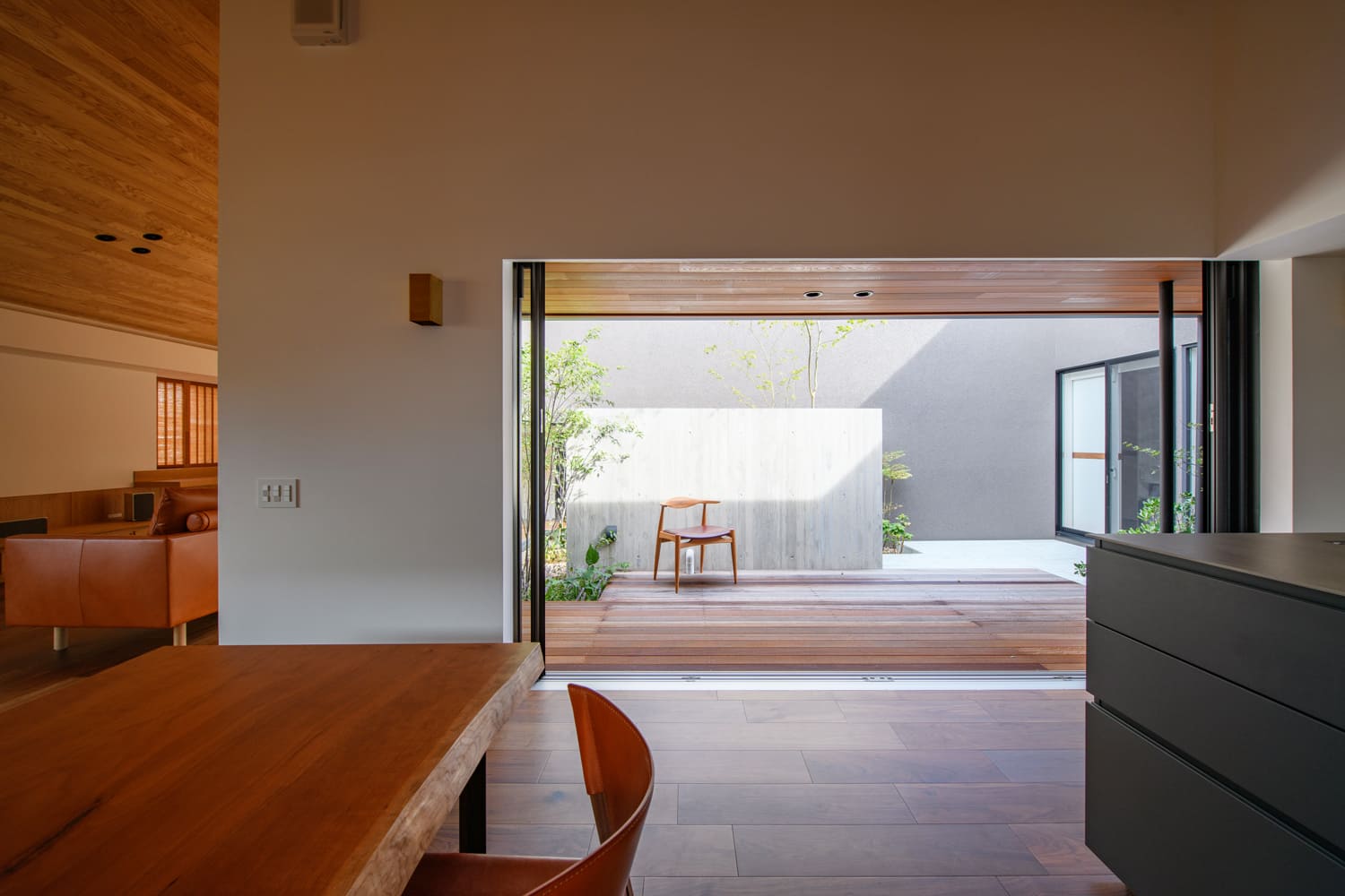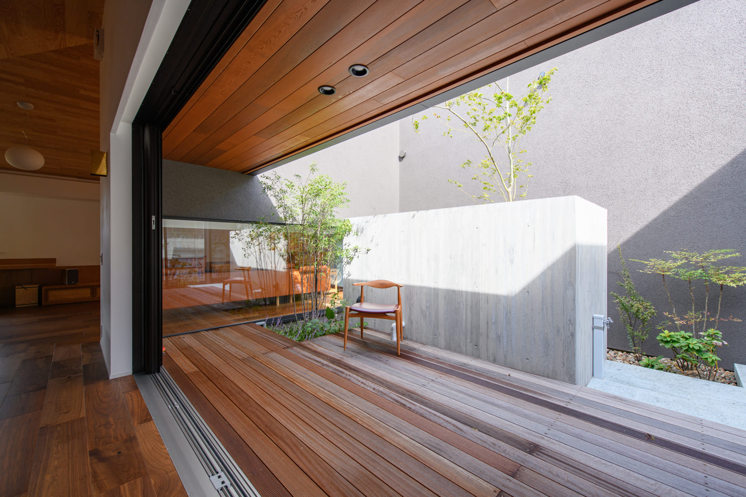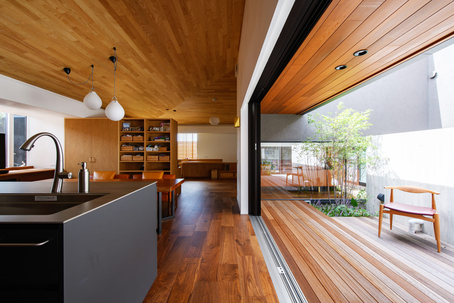 そうすると、キッチンは中庭のウッドデッキとひと続きになり、まるで屋外で料理をしているかのような、圧倒的な開放感を味わえます。