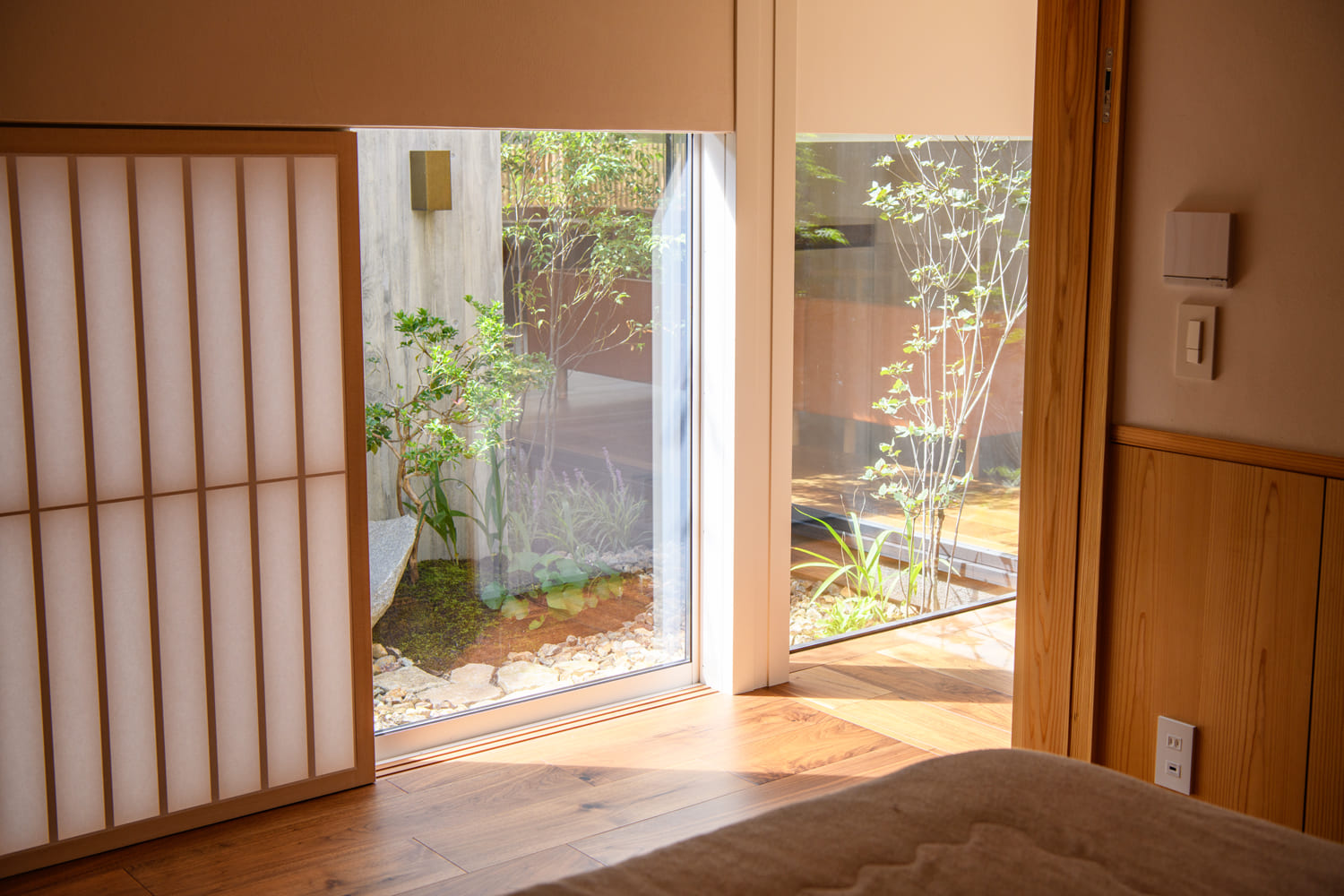障子を通して和らいだ光が、眠りへと誘い、朝には庭の木々の気配と共に、穏やかな目覚めを約束してくれます