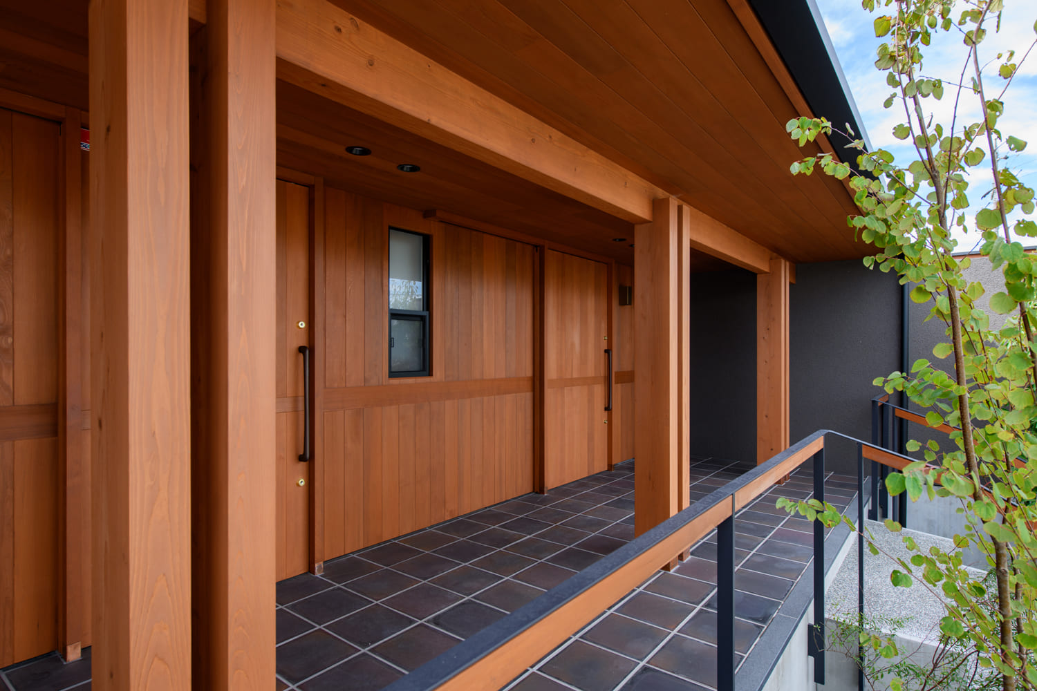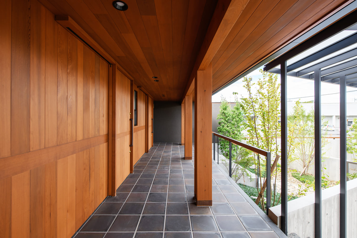 玄関から室内へと続くアプローチは、屋根に守られながらも、外の心地よさを感じられる半屋外の回廊になっています。