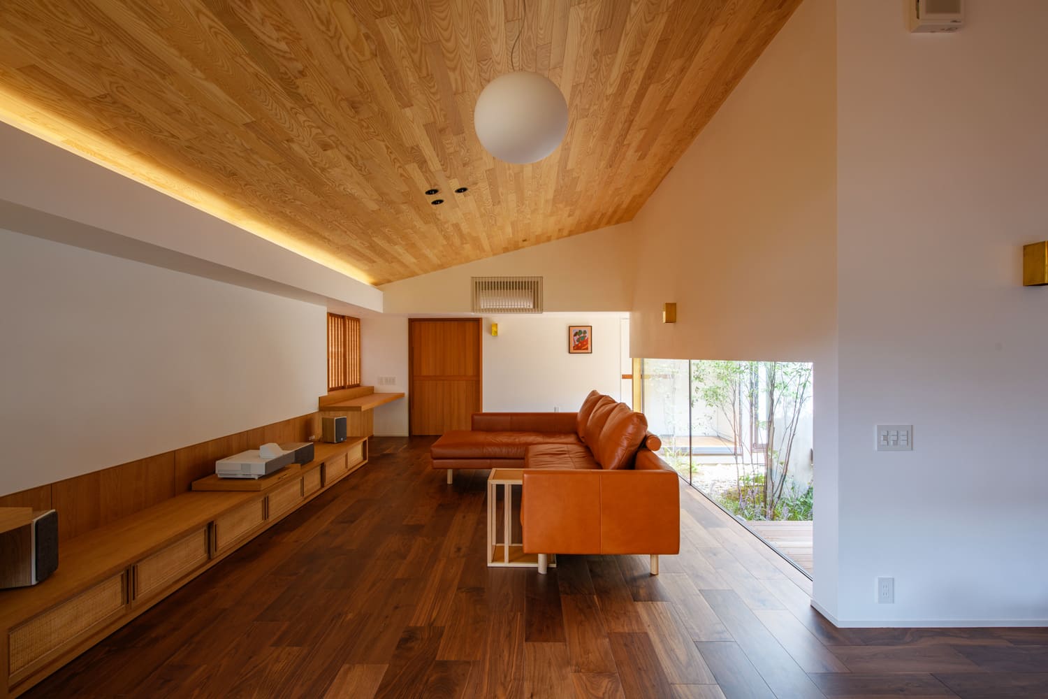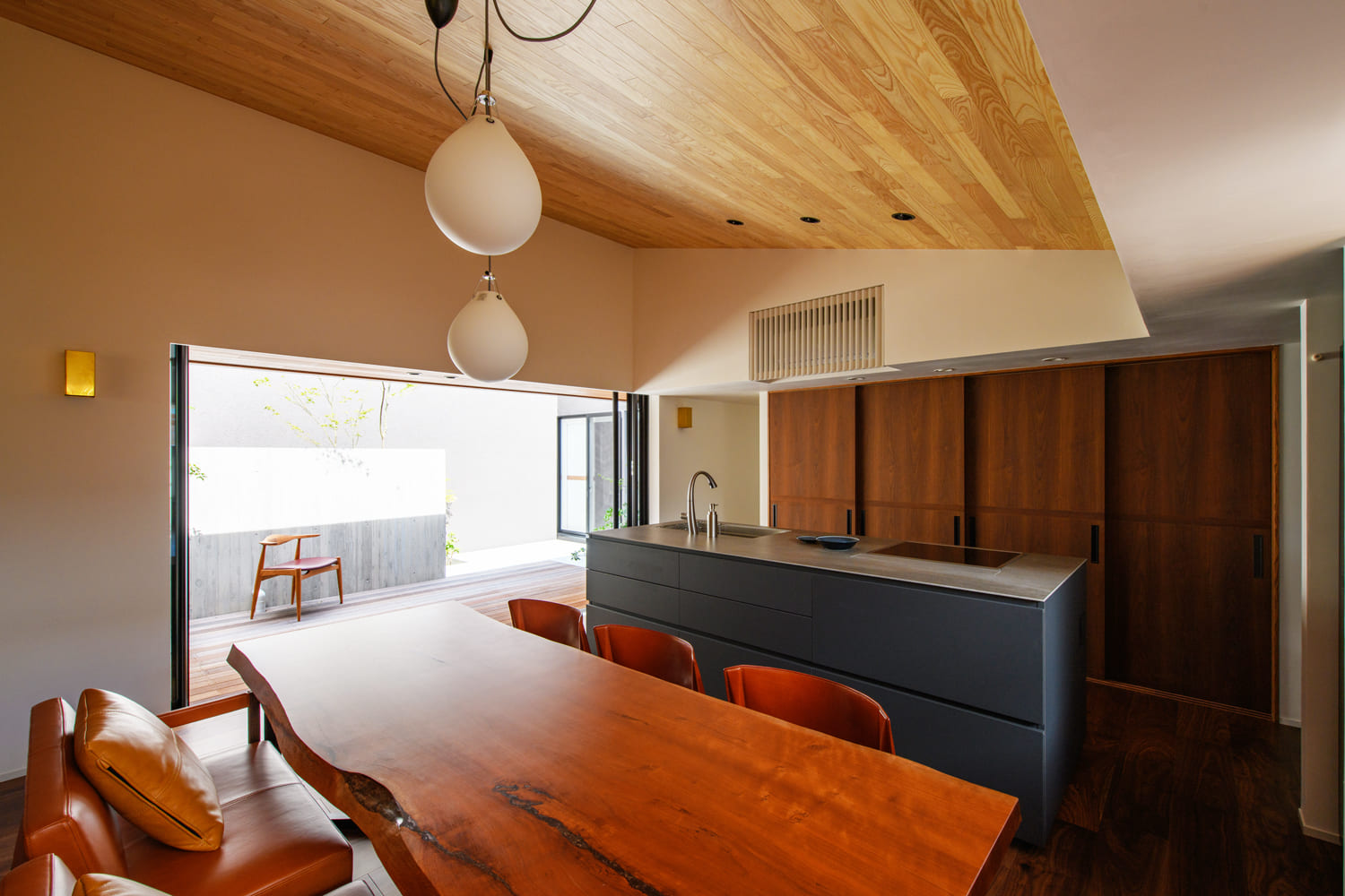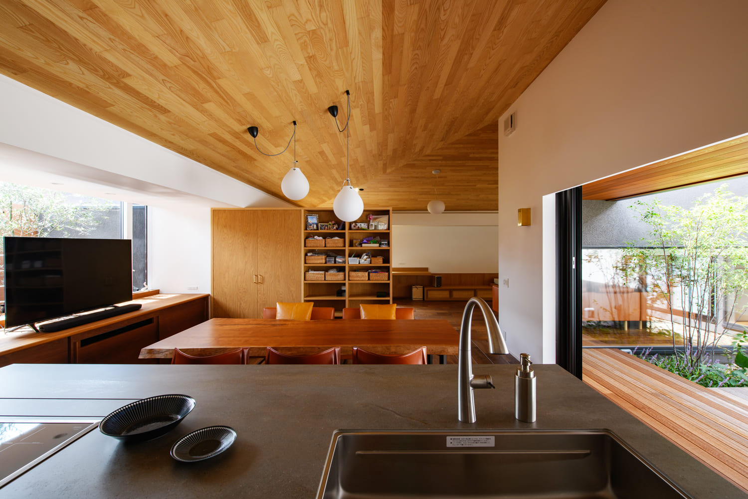 この家の主役は、リビングからダイニングまで続く、美しい板張りの勾配天井。