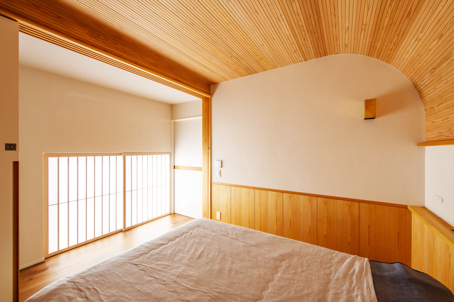 寝室】障子ごしの柔らかな光と、曲線を描く木の天井。庭の気配を感じて、穏やかに目覚める。