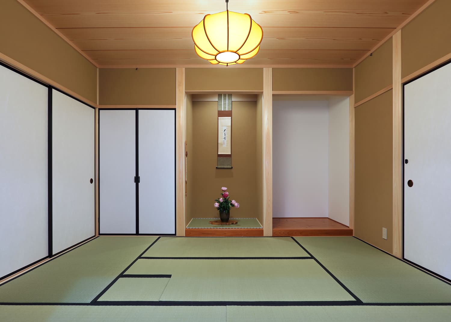 掛け軸や生け花が映える凛とした空間は、日本の美しい伝統を大切にする、この家の象徴です。