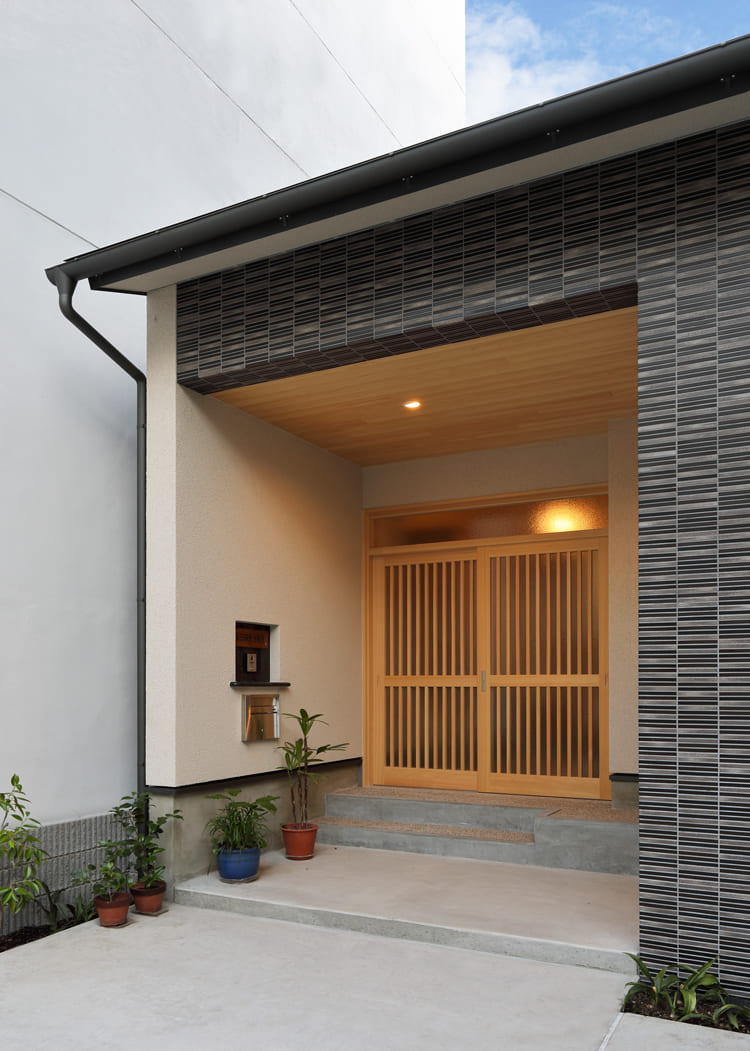 家の顔である外観は、落ち着いた色合いのタイルと温かみのある木の格子戸が、訪れる人を優しく迎えます。