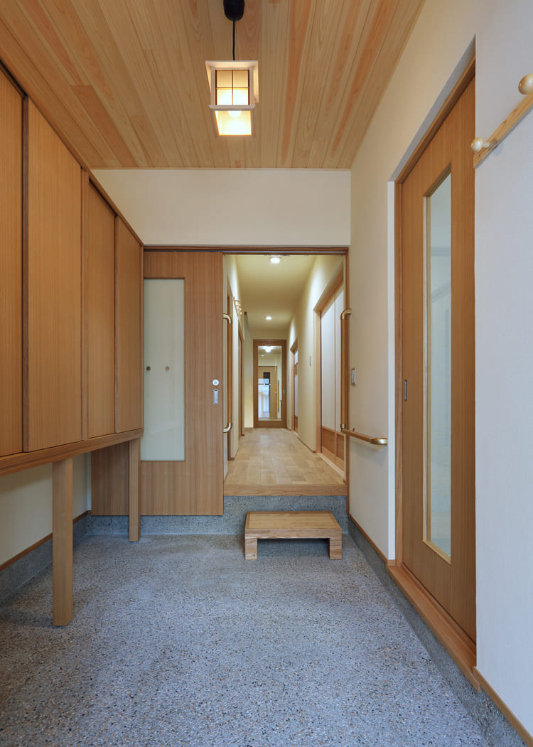 玄関の扉を開けると、美しい木目の天井と趣のある土間が迎えてくれます。