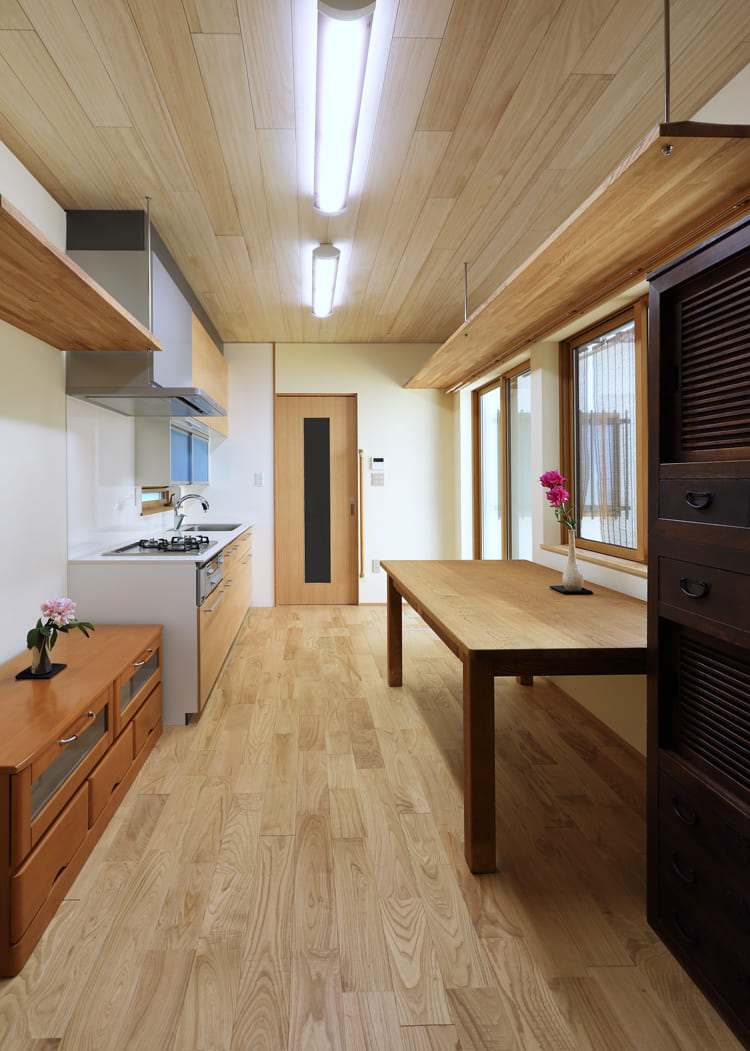 天井や床にふんだんに使われた無垢材が、心地よい空間をつくりだすダイニング・キッチン。