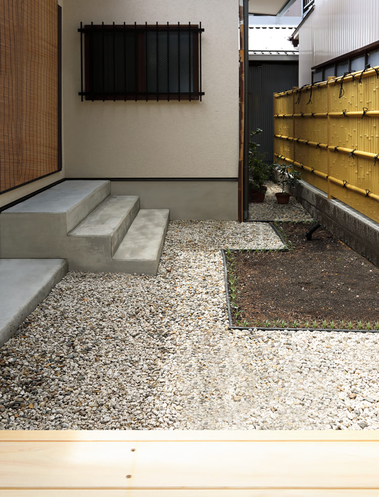 洗い出し仕上げの床と、清々しい竹垣が、訪れる人を日常から非日常へと誘う、静かなアプローチ。