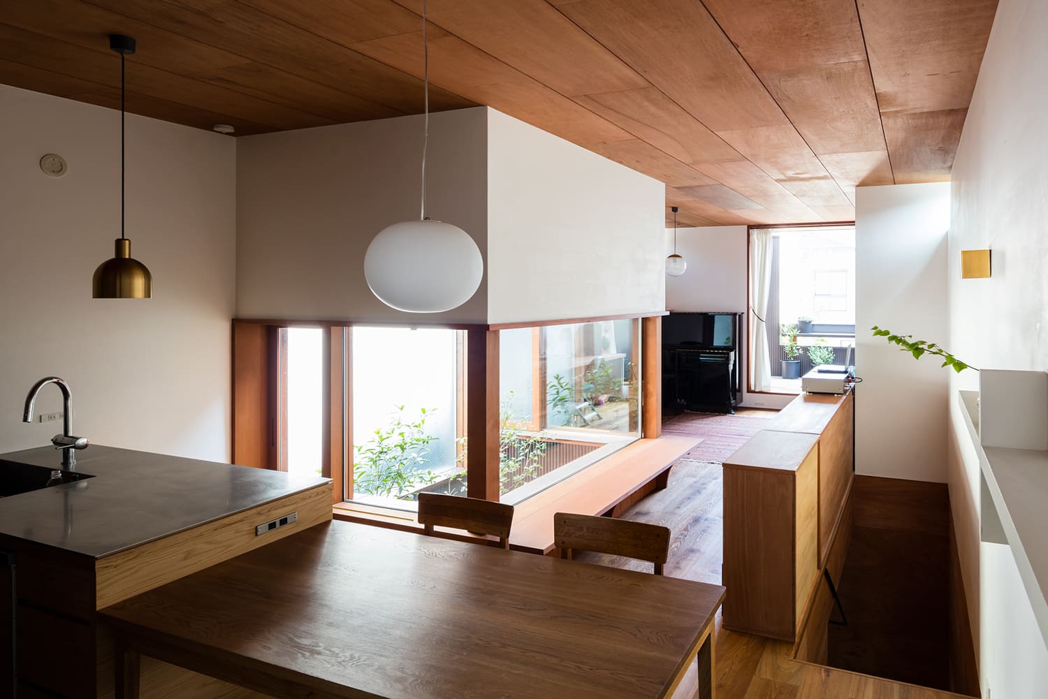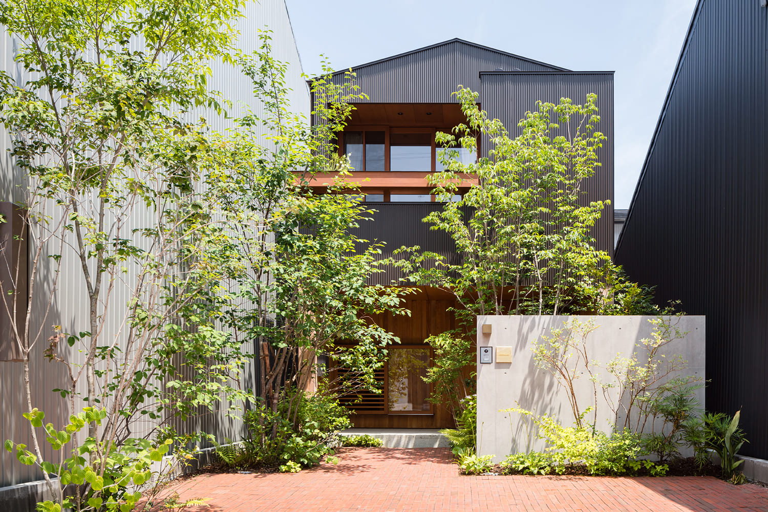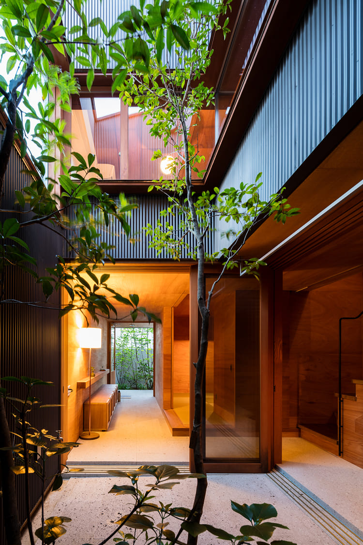 都市の真ん中で、森の中にいるような暮らしがしたい。この住まいは、そんな夢を叶えるために、家の真ん中に、空へと伸びる木が一本植えられた、細長い「路地」のような中庭を設えました。