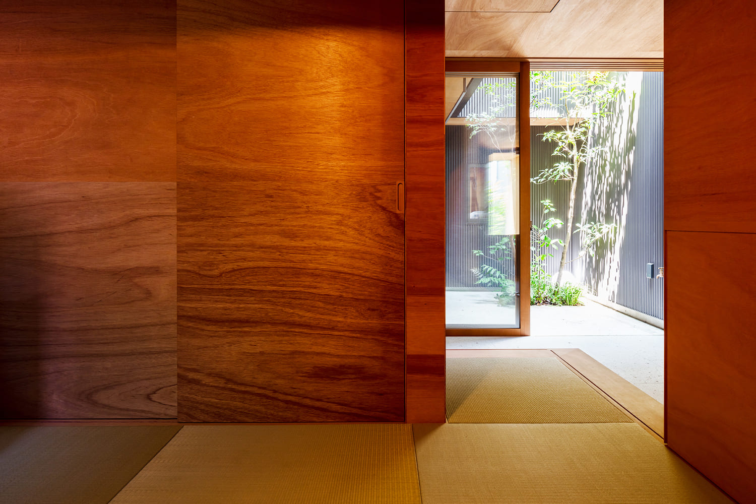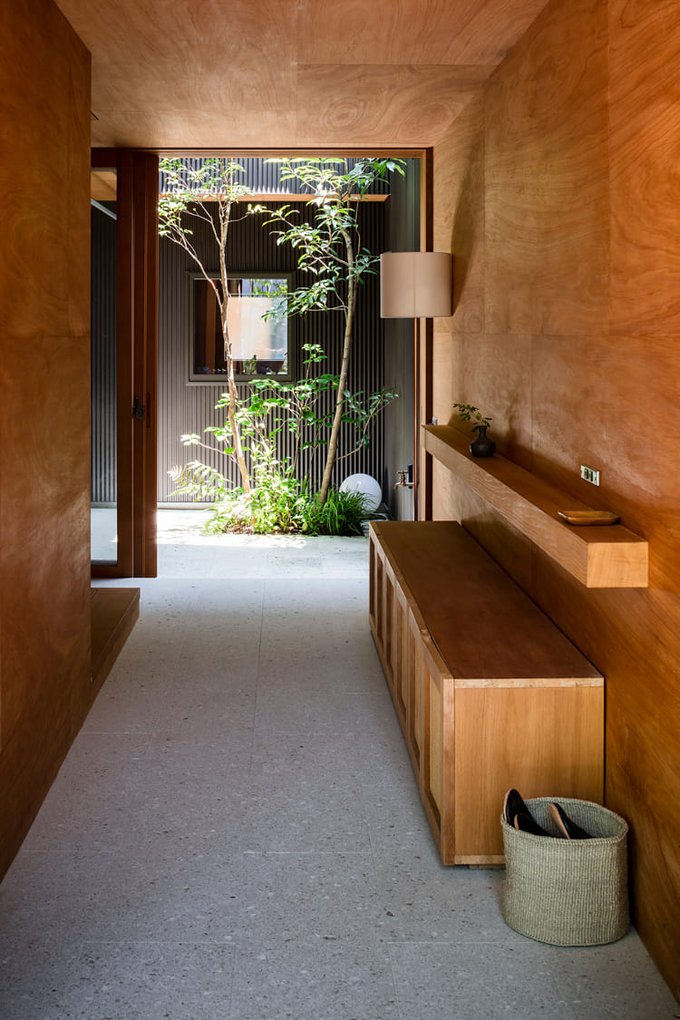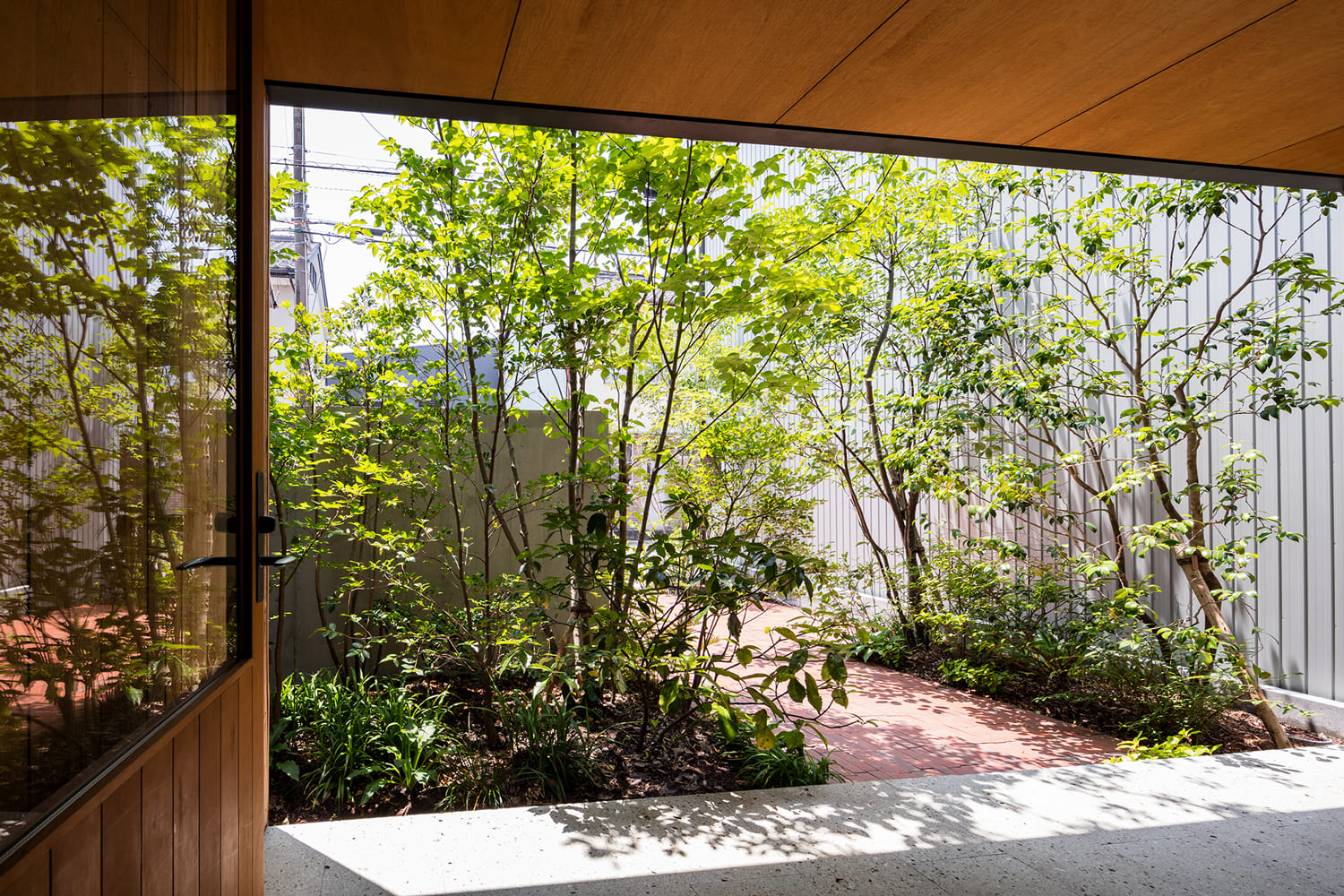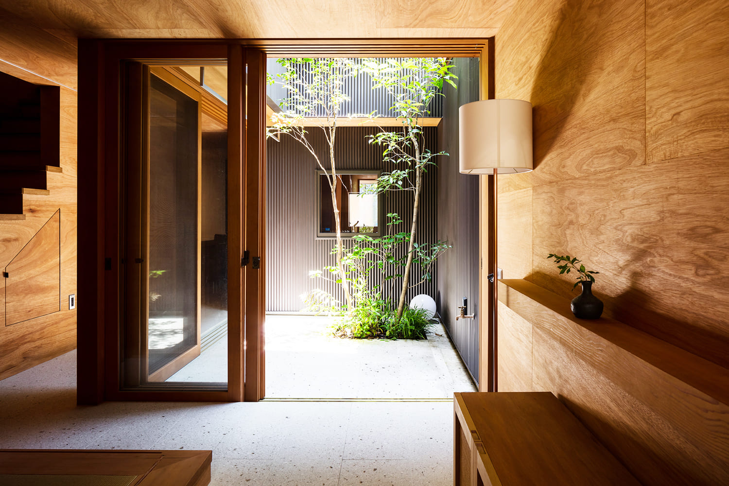 都市の真ん中で、森の中にいるような暮らしがしたい。この住まいは、そんな夢を叶えるために、家の真ん中に、空へと伸びる木が一本植えられた、細長い「路地」のような中庭を設えました。