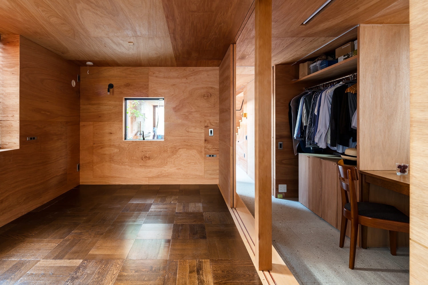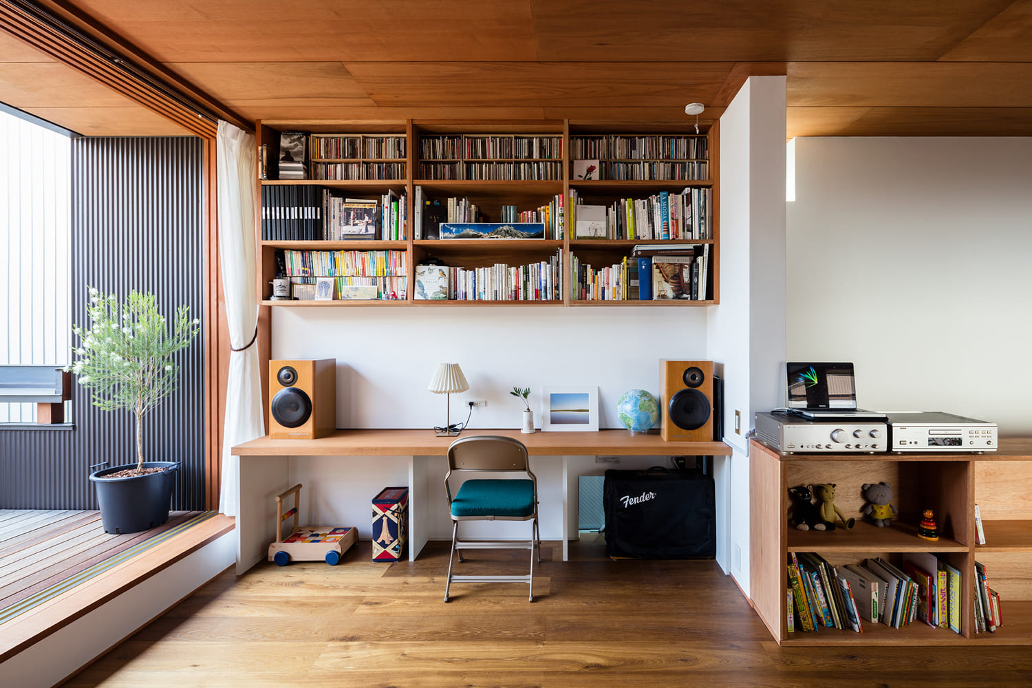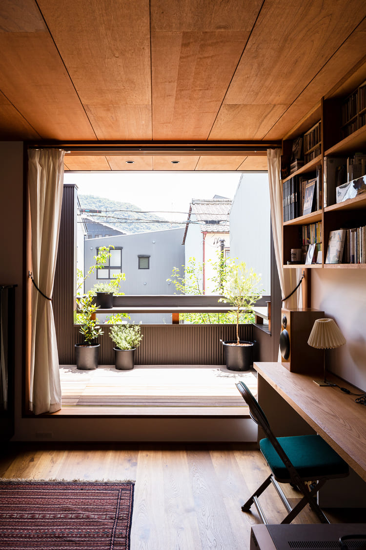 この家には、決まった「書斎」はありません。リビングの隅や、廊下の窓辺など、家中の心地よい場所に、家族が自由に使えるワークスペースを設けました。庭の緑を眺めながら、仕事や勉強に集中する。暮らしのシーンに、学びと遊びが自然に溶け込む設計です。
