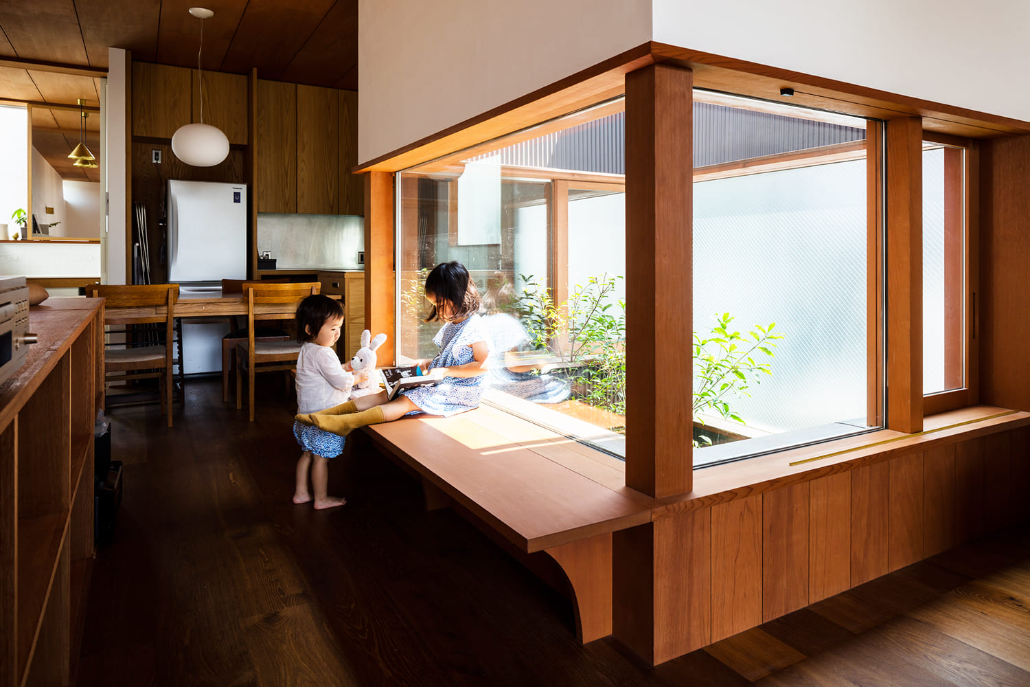 LDKの中心は、中庭に面して長く続く、造作のベンチです。日当たりの良いこの場所は、お子様が遊んだり、家族で本を読んだり、庭の木々を眺めながらお茶を飲んだり。思い思いの時間を過ごせる、家族みんなの特等席。美しい木漏れ日の下で、たくさんの笑顔と物語が生まれます。