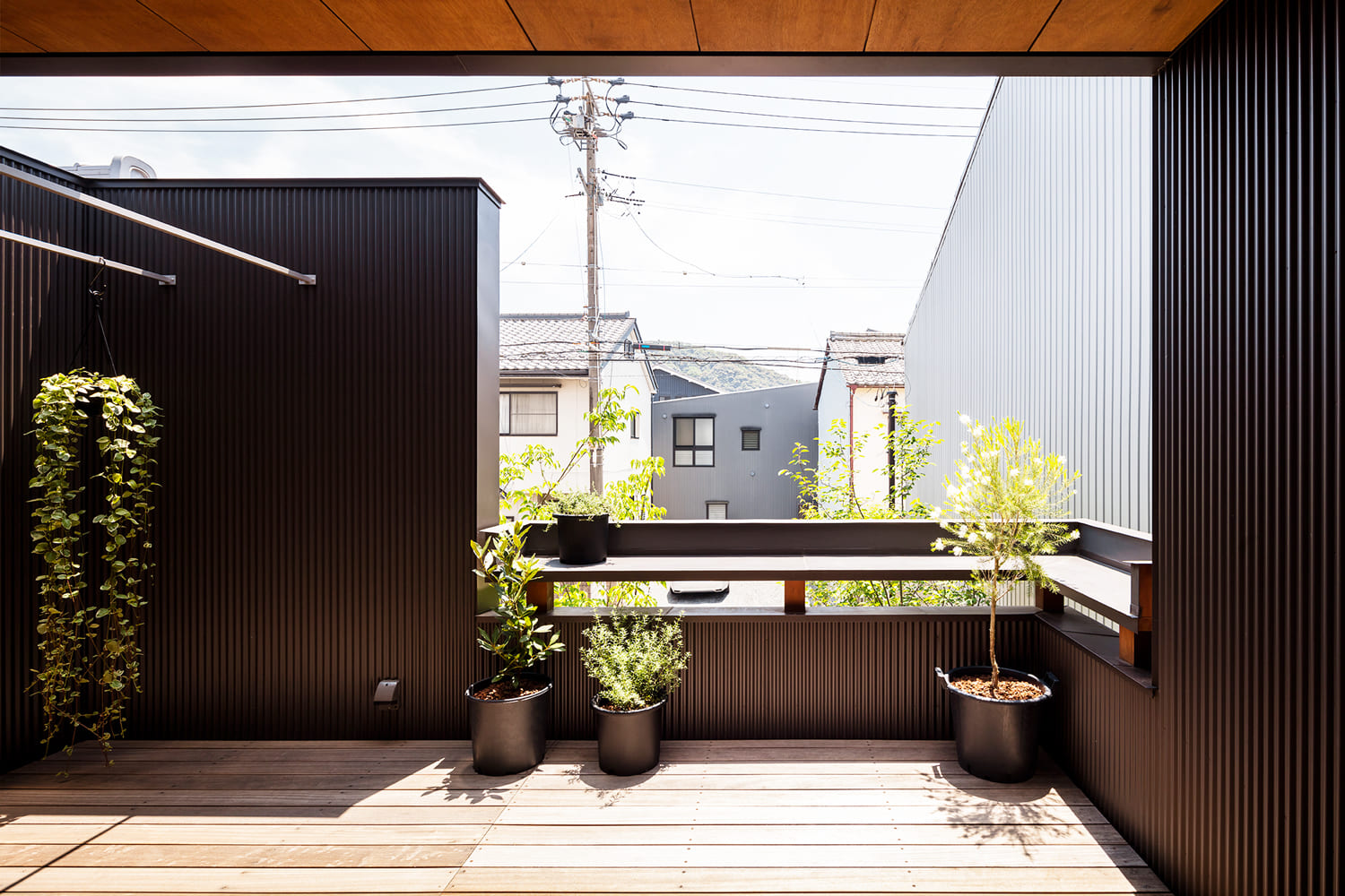 この家の魅力は、玄関にたどり着くまでのアプローチから始まります。豊かに植えられた木々が、訪れる人を日常から非日常へと誘う、緑のトンネルのよう。ダークな色調の外壁が、建物の存在感をあえて消し、周囲の緑と一体となることで、まるで森の中にひっそりと佇む隠れ家のような、静かでプライベートな空間を創り出しています。