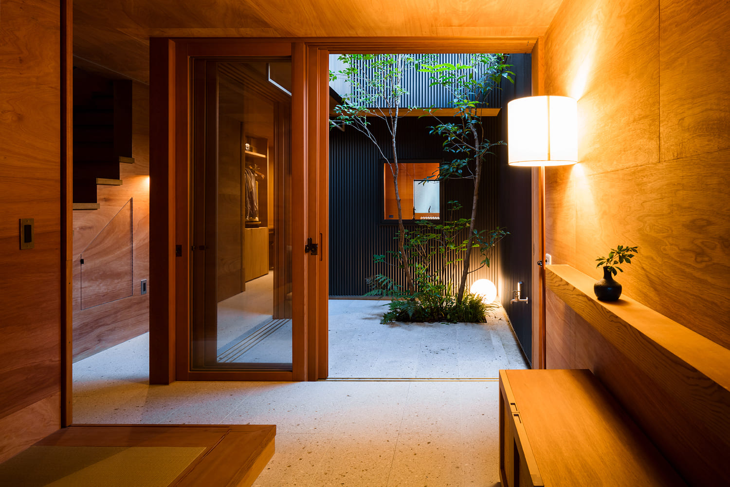 玄関の扉を開けると、まず目に飛び込んでくるのは、ガラスの向こうでライトアップされた、美しい中庭の景色です。柔らかな間接照明と、土壁の温かい質感が「おかえりなさい」と優しく迎えてくれるようで、一日の疲れがすっと癒やされていくのを感じます。