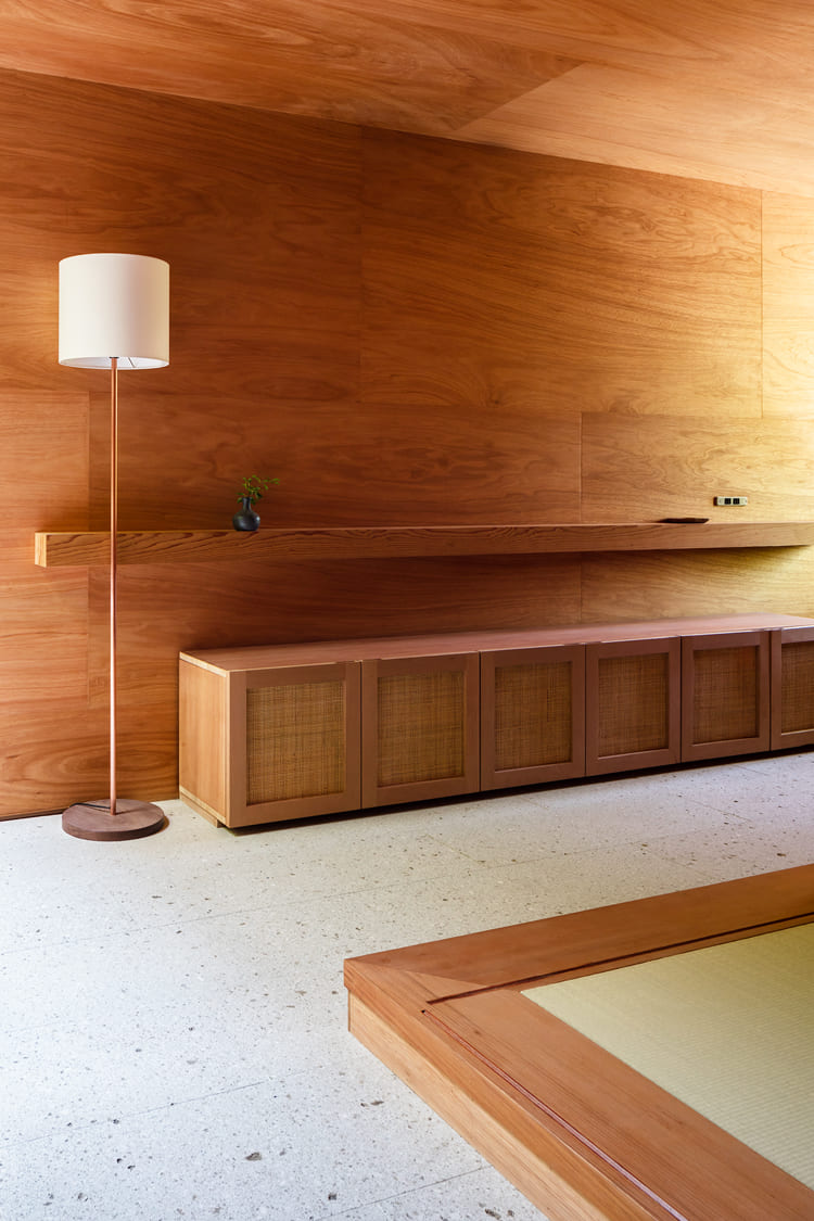 この家の廊下は、常に中庭の木々を隣に感じられる、まるで「屋根のある小径」のよう。ざらりとした質感の土壁が、空間に深い趣と陰影を与えます。ただの通路ではなく、家中に光と緑、そして心地よい風を運んでくれる、この家のメインストリートです。