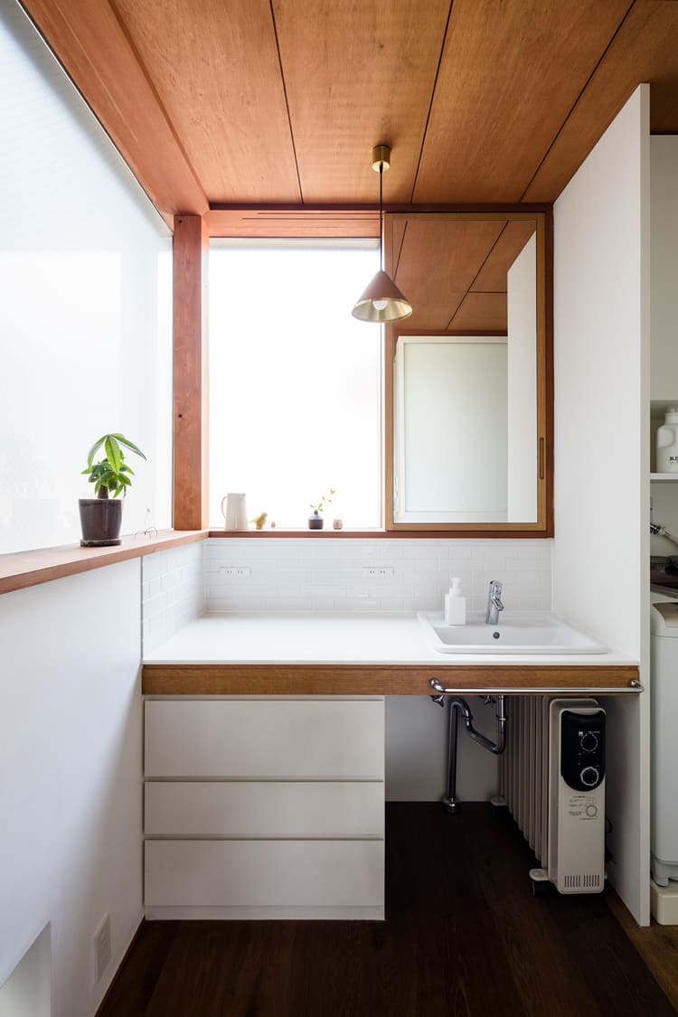 【洗面台】コンパクトで、機能的。木の温もりが嬉しい、シンプルな空間。