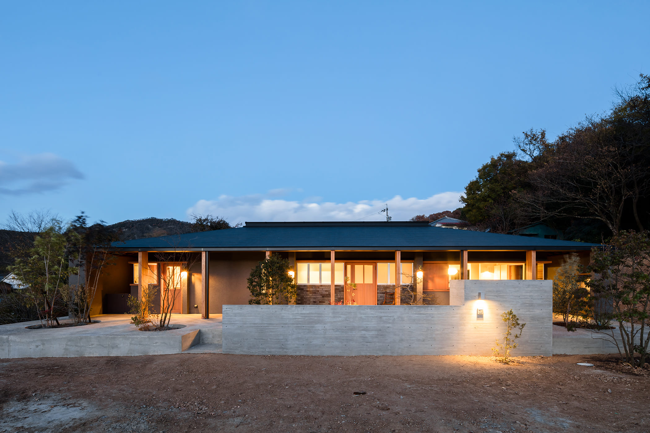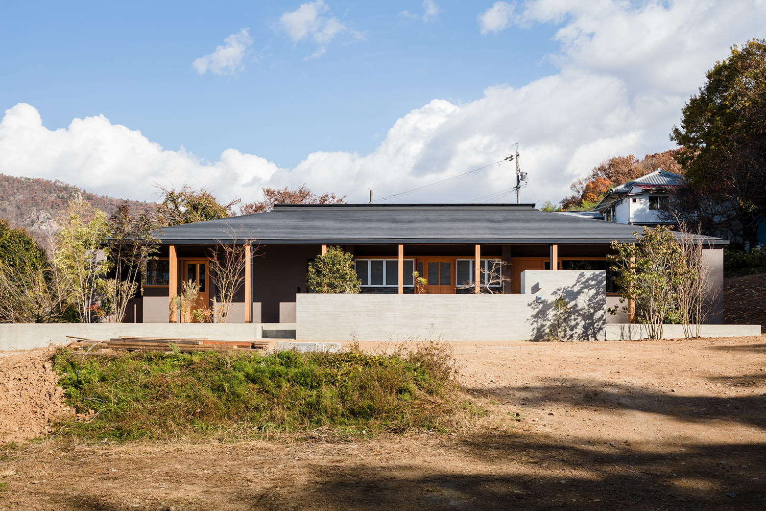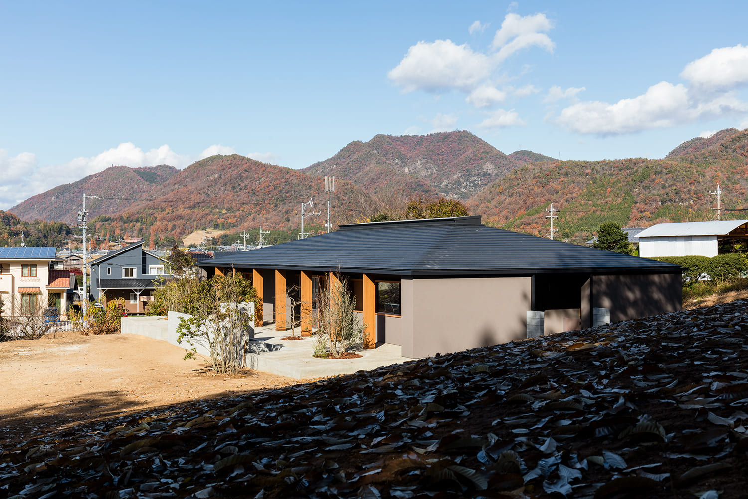 【外観】山々と、静かに向き合う。風景に溶け込む、伸びやかな平屋。