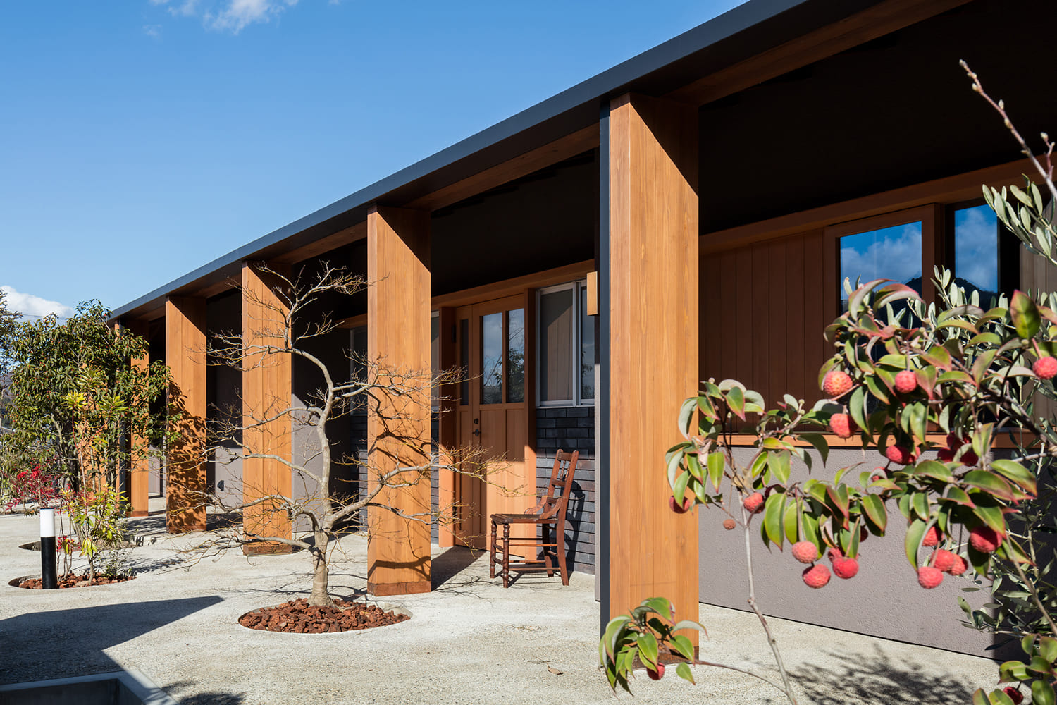 リズミカルに並ぶ美しい木の柱と、深い軒が、日本の伝統的な建築美を感じさせ、堂々とした品格と、自然への敬意を表現しています。