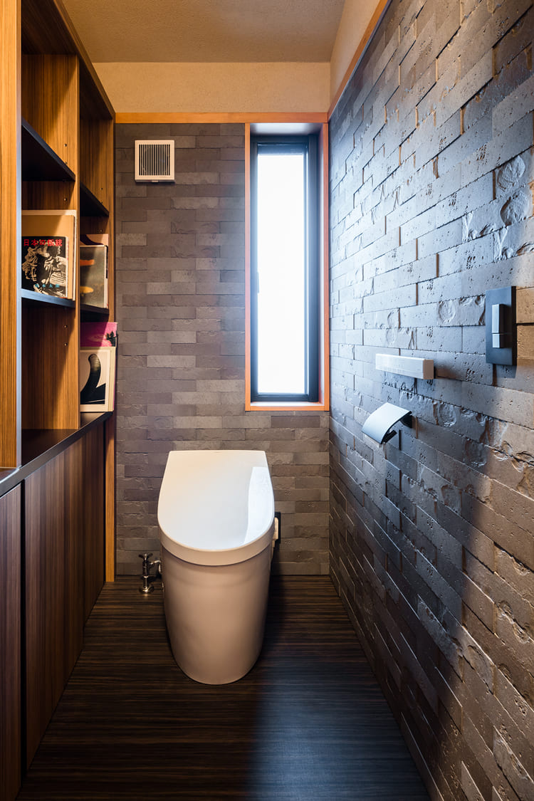【トイレ】毎日使う場所にも、本物の質感を。石の壁が、心を静める空間。