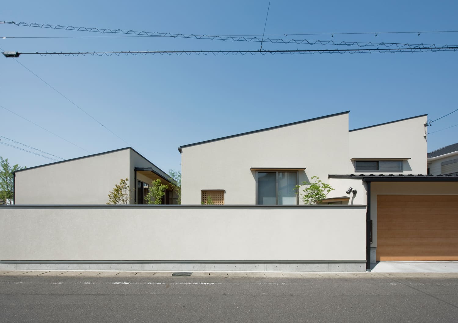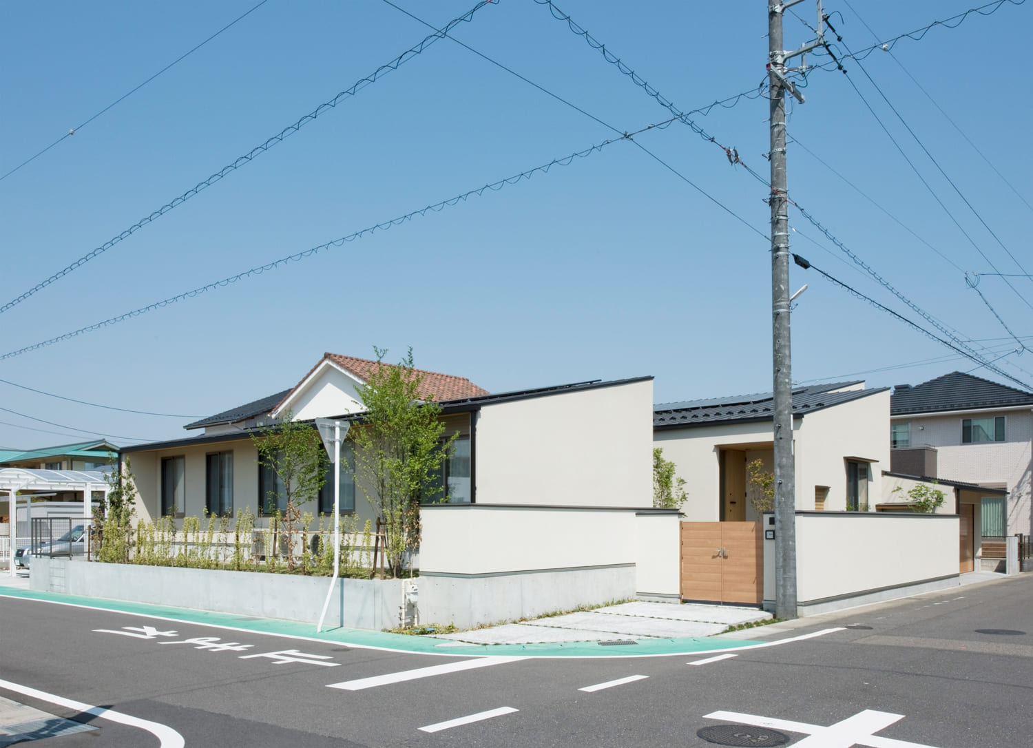 【外観】シャープな屋根と、温かみのある佇まい。プライバシーを守り、暮らしへの期待感を高める。