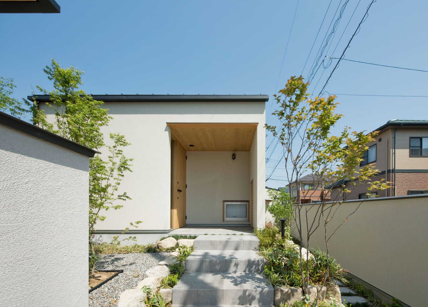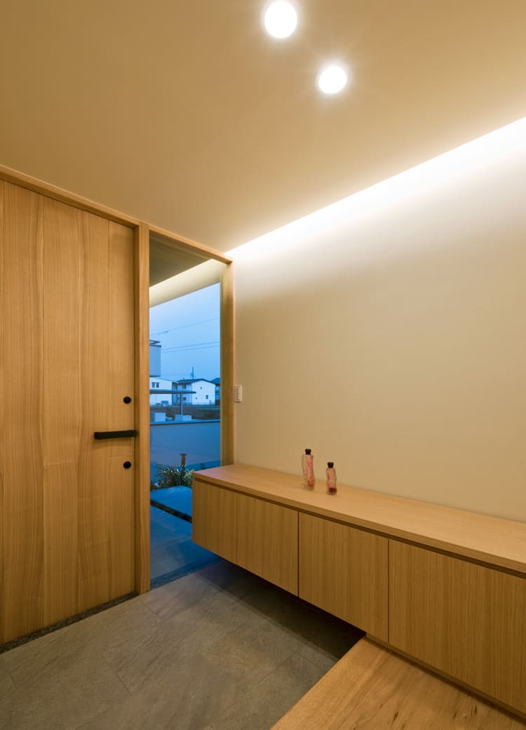 リズミカルに連なる、シャープな片流れ屋根。そして、外からの視線を遮り、家族のプライバシーを確保する、シンプルで美しい壁。閉じるべきところは閉じながら、木で仕上げた温かみのある玄関が、訪れる人を優しく招き入れ、その先に広がる心地よい空間への期待感を高めてくれます。