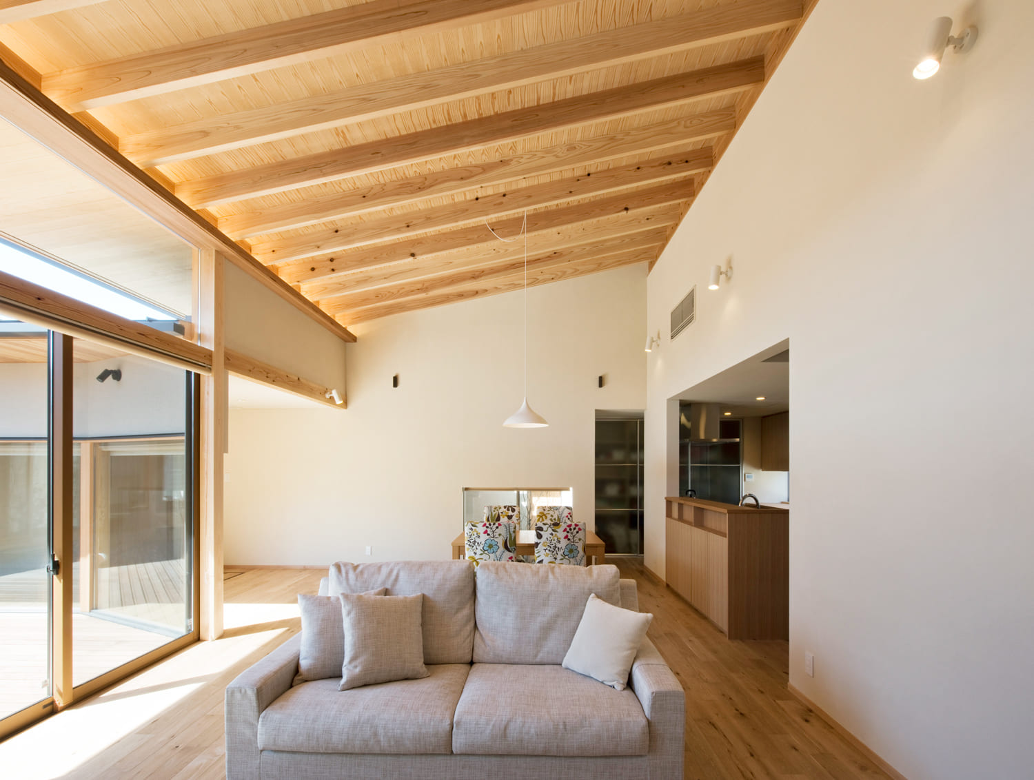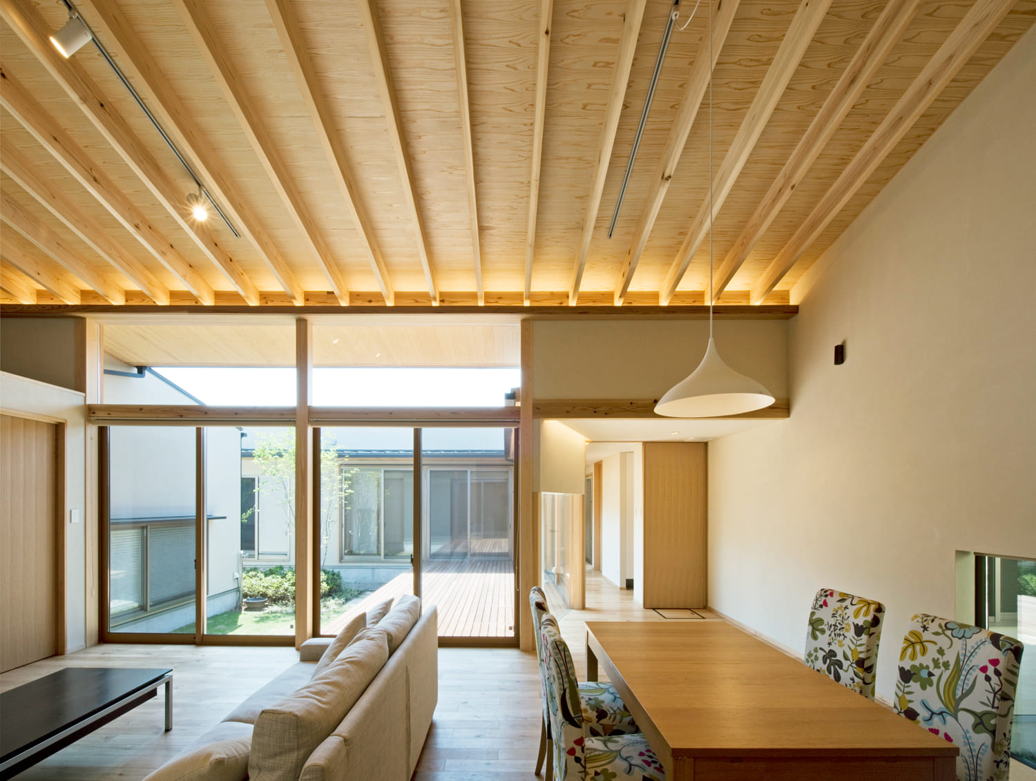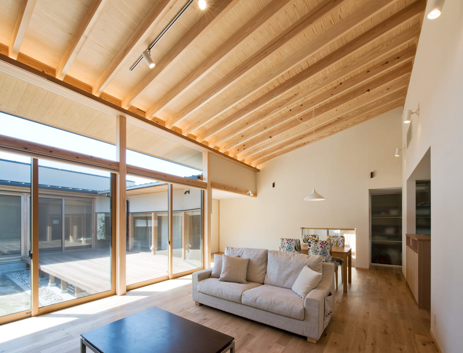 【リビング】高く、美しい木の勾配天井。中庭からの光が満ちる、開放感あふれる大空間。