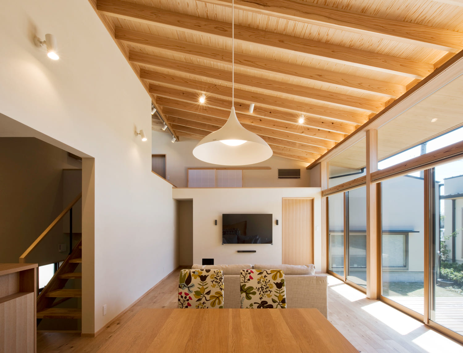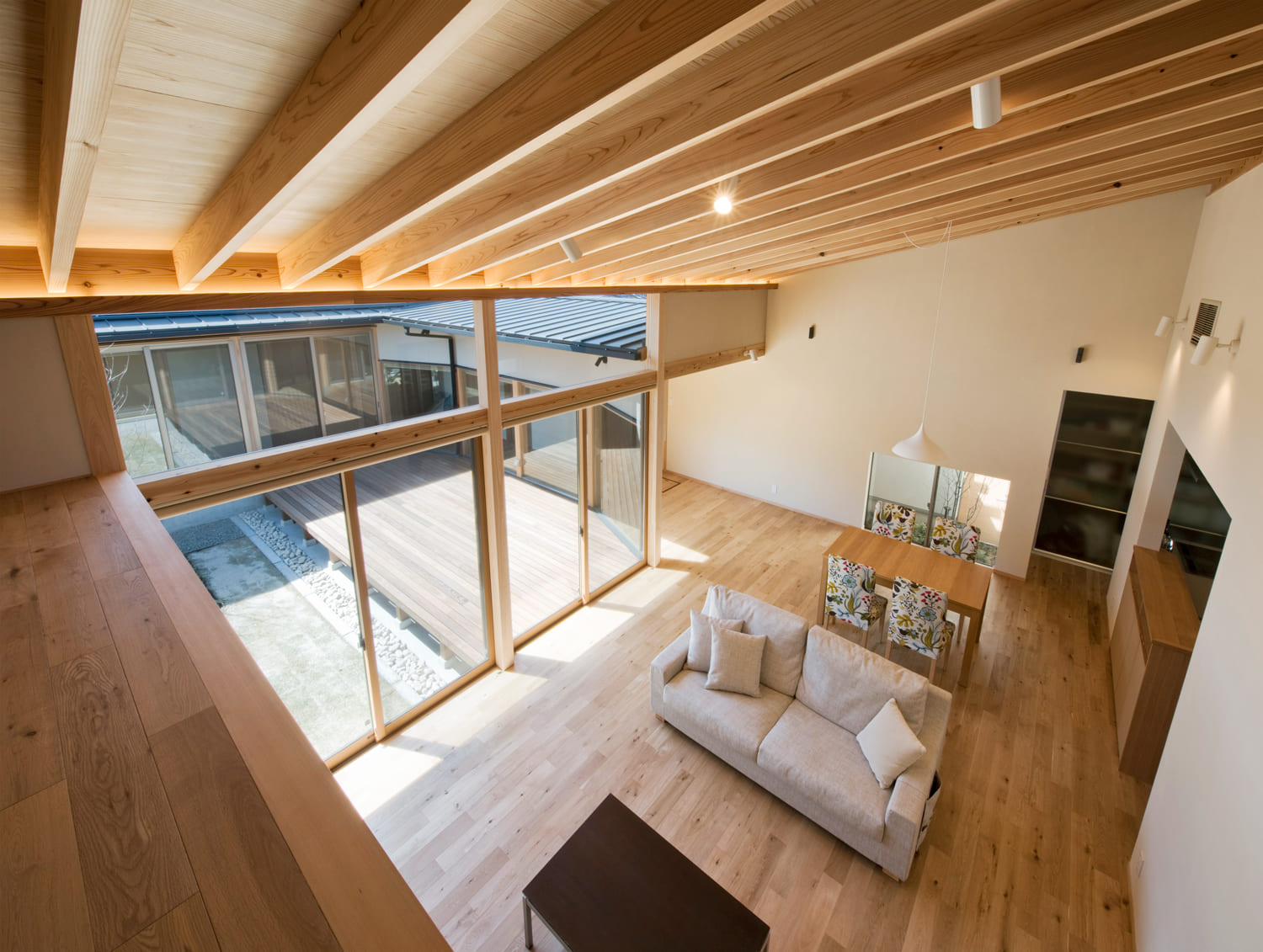 この家のリビングは、中庭に面した大きなガラス窓から、たっぷりの光が差し込む、明るく開放的な空間です。見上げれば、屋根の形をそのまま活かした、美しい木目の勾配天井が広がり、空間にダイナミックな広がりと、木の温もりを与えています。いつでも庭の緑を眺めながら、家族とのびのびと過ごせる、最高のくつろぎの場所です。