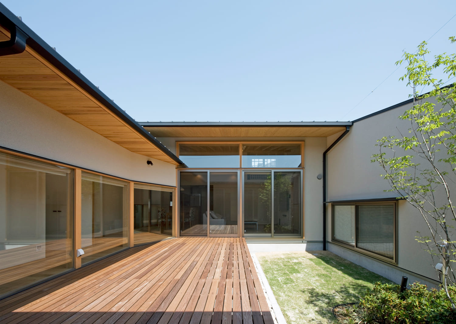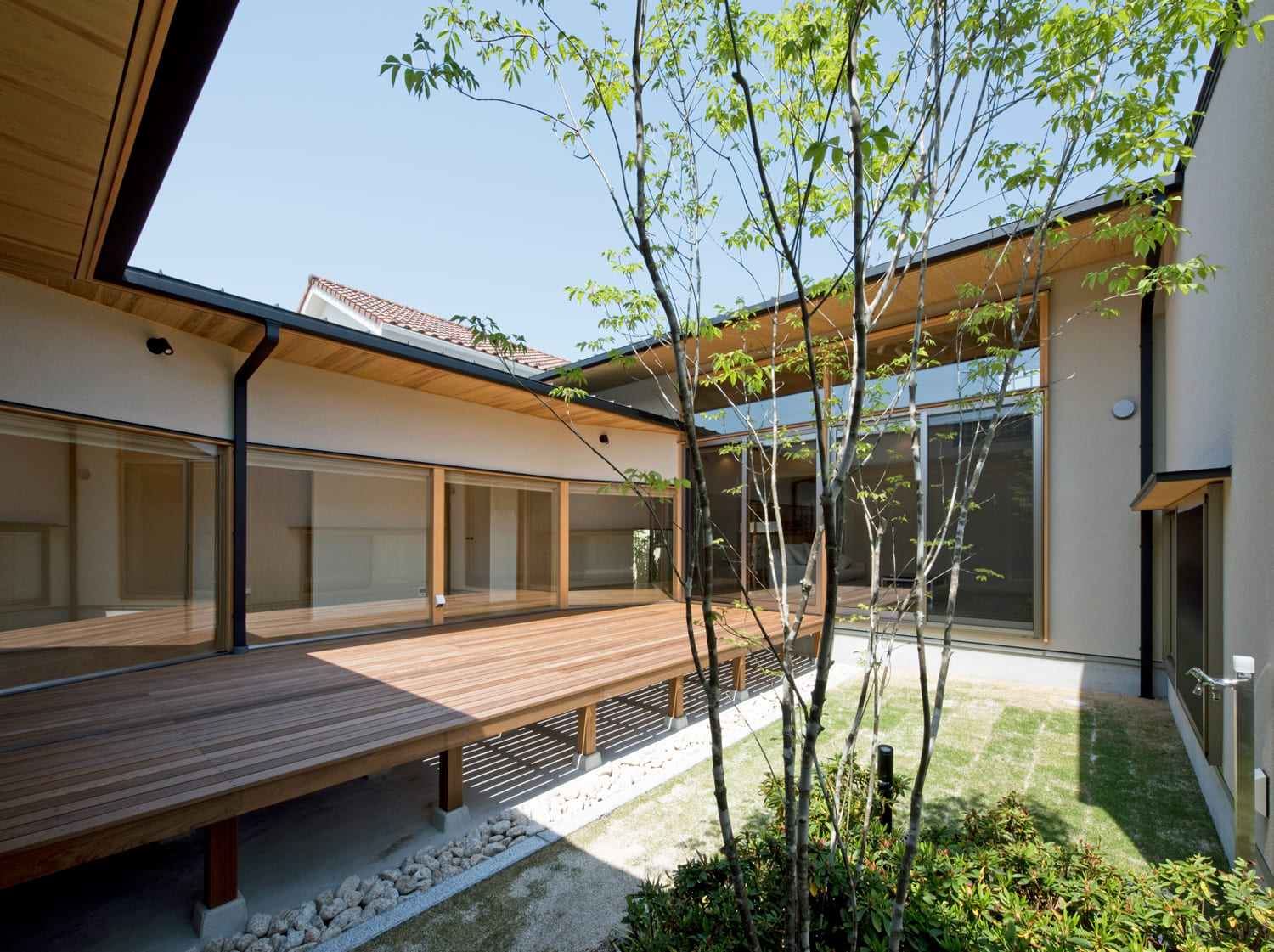 現代の暮らしが求める「開放感」と、都市で暮らす上で不可欠な「プライバシー」。この二つを両立させるために、私たちは、建物を「コ」の字型に配置し、その中心に、家族だけのプライベートな中庭を設けるという答えにたどり着きました。