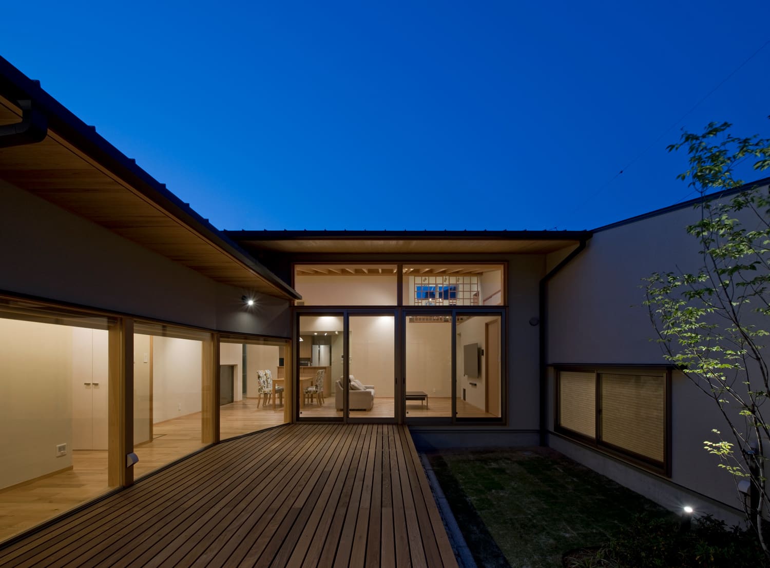 この住まいの心臓部とも言えるのが、「コ」の字型の建物に囲まれた、広々としたウッドデッキです。リビングからも、隣の和室からも、段差なくスムーズに出入りが可能。天気の良い日には、庭で遊ぶ子どもを見守りながら、デッキでゆっくりお茶を飲む。そんな、内と外が一体となった、豊かな暮らしの中心となる空間です。
