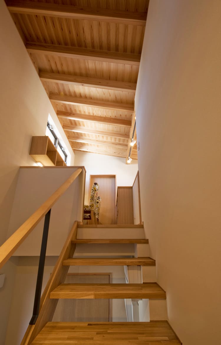 【階段】次の空間への、小さな期待感。木の温もりが、家全体を繋ぐ。