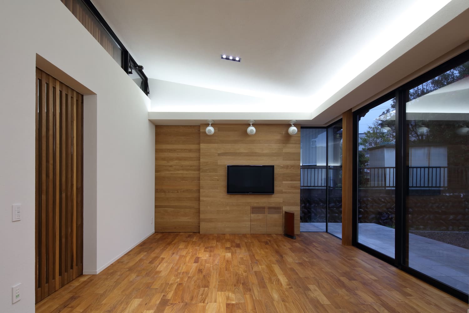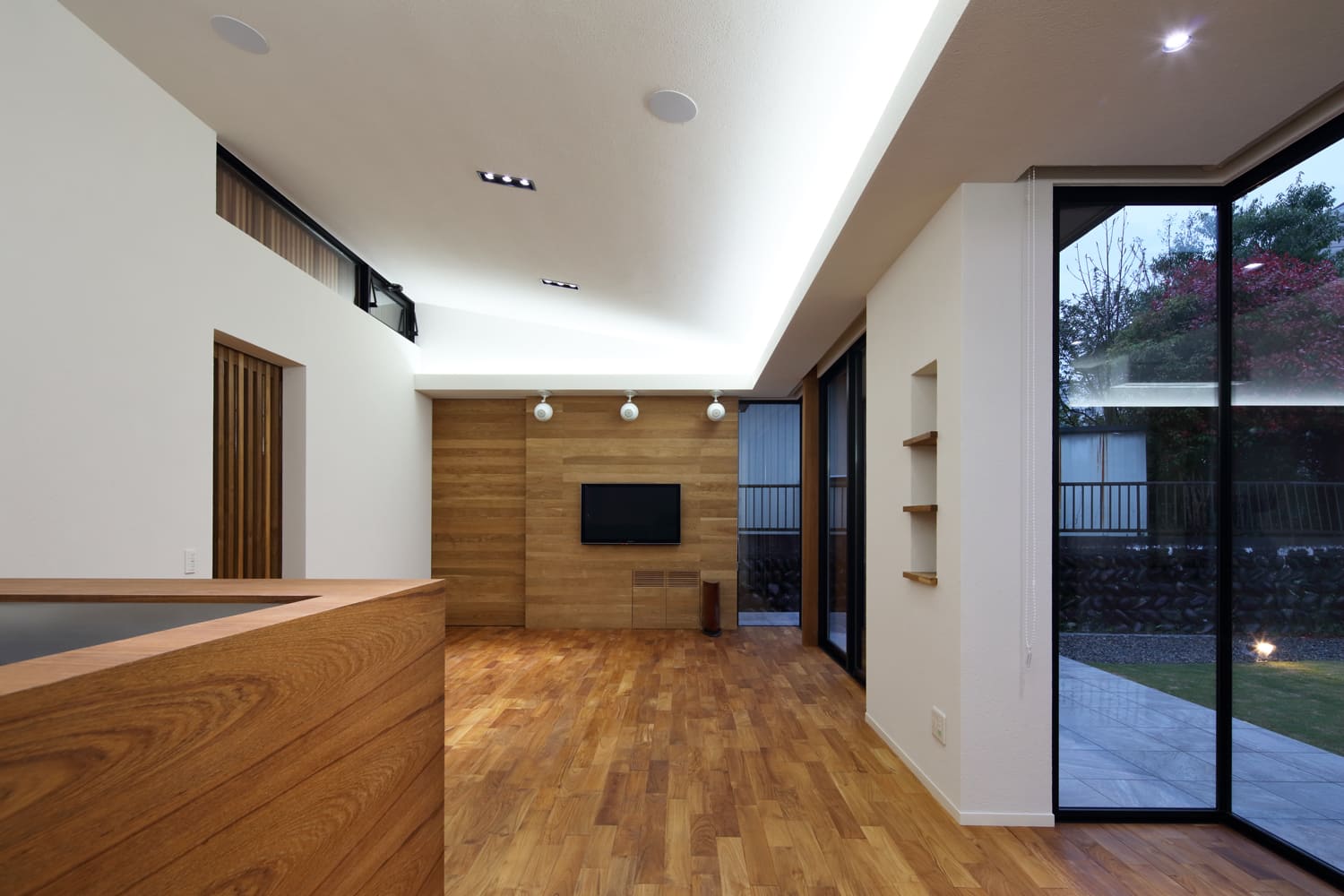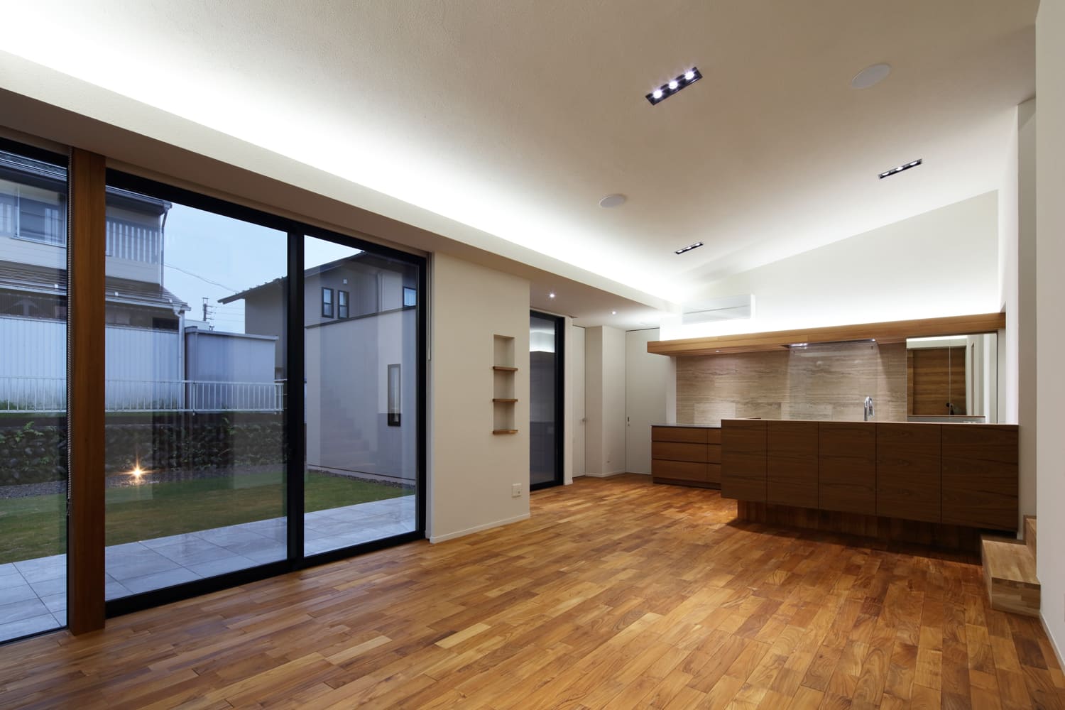 【リビング】庭とひとつになる、光のリビング。柔らかな間接照明が、上質な時間を演出する。
