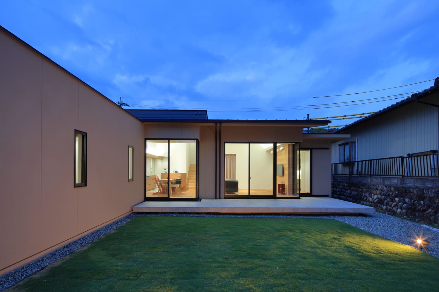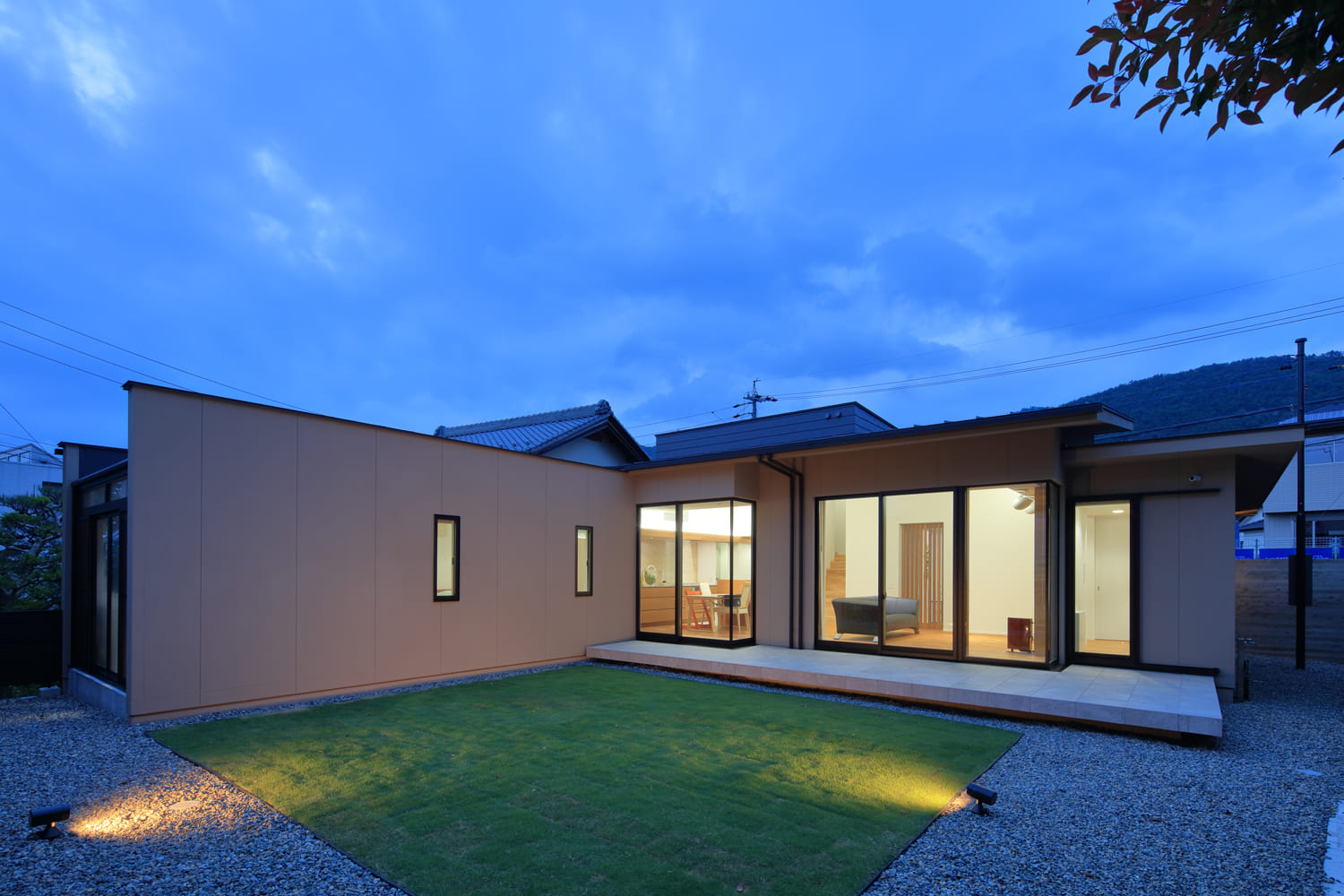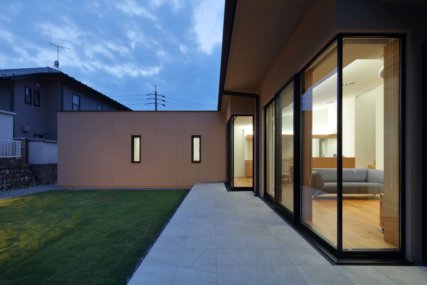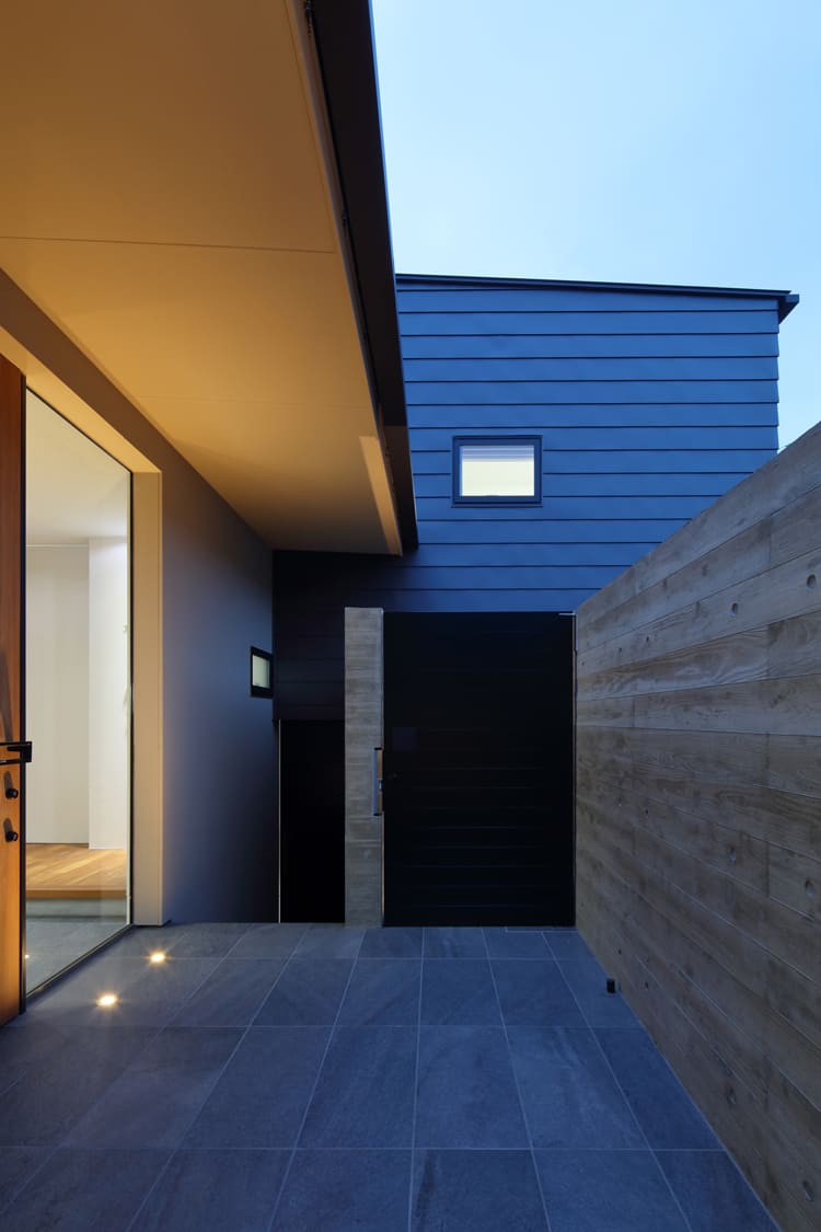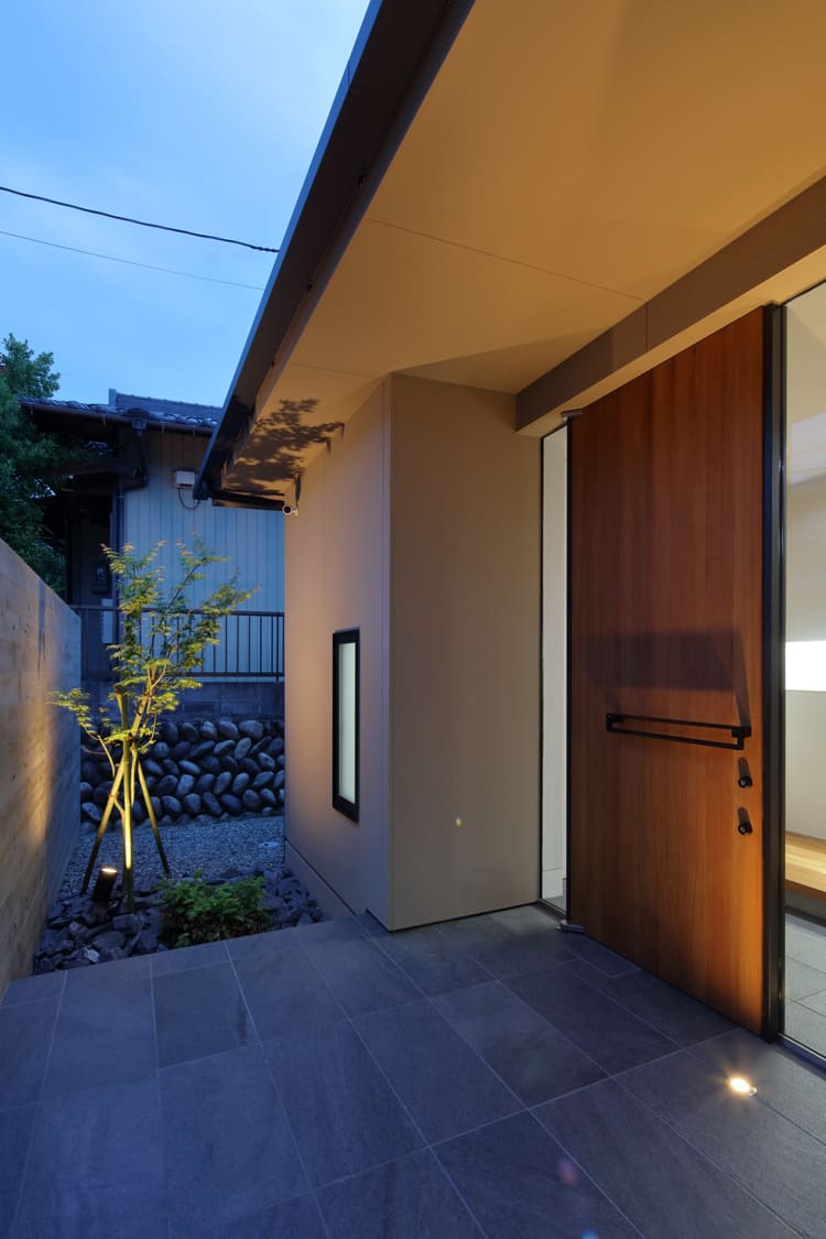 プライバシーを守るコンクリートの壁と、ガレージのある二階建ての棟、そして庭を囲む平屋の棟。異なるボリュームの建物を組み合わせることで、街並みにリズミカルで美しい表情を生み出します。夜には、計算された照明が壁や木々を優しく照らし出し、温かい室内の光がこぼれ、まるで高級ホテルのような、気品あふれる佇まいを演出します。