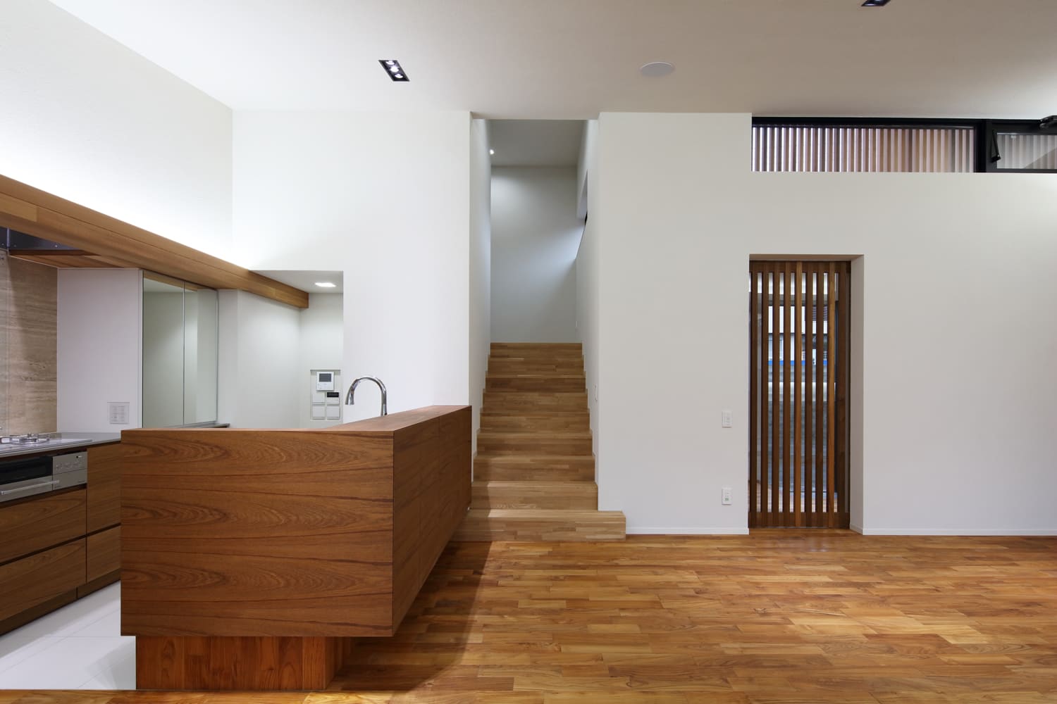 リビングの一角に設けられた階段の横には、空間を緩やかに仕切る、美しい木の格子を設えました。視線を完全に遮ることなく、奥の空間への期待感を高める、日本の伝統美が息づくデザインです。家のどこにいても、木の温もりと、職人の丁寧な手仕事を感じることができます。