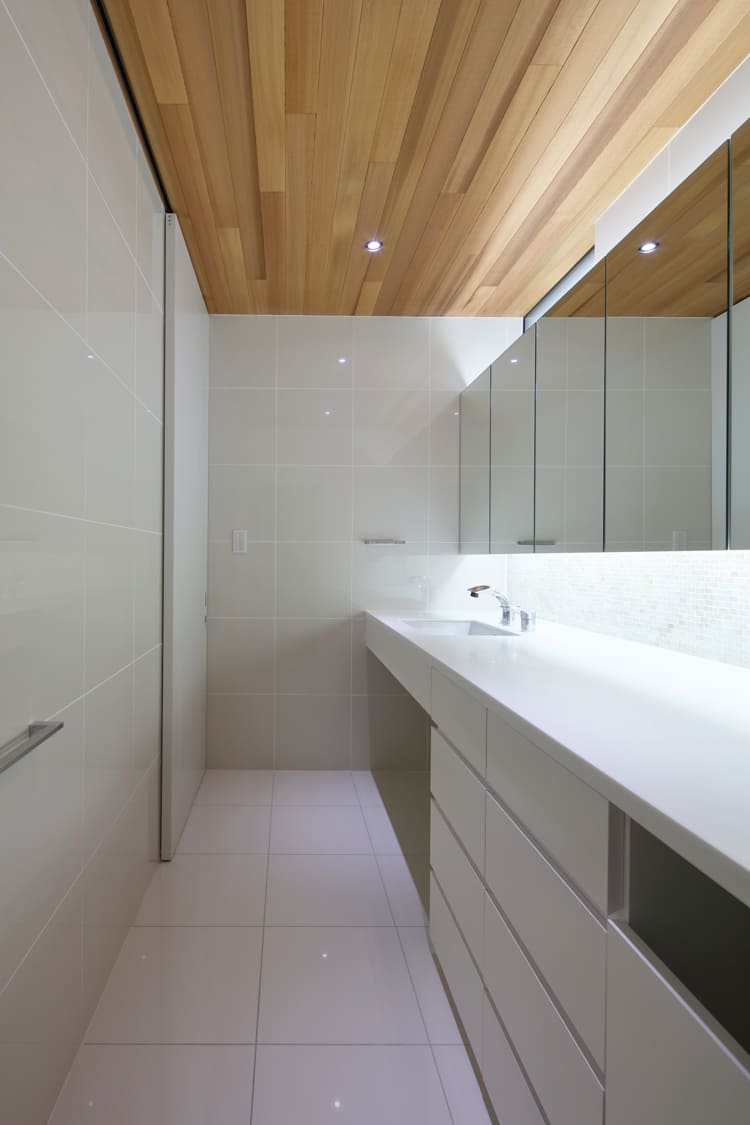 白を基調とした、清潔感あふれる洗面スペース。余計なものを削ぎ落としたミニマルなデザインの中に、木の温もりをプラスしました。柔らかな間接照明が、まるでホテルのパウダールームのような上質な雰囲気を演出します。気持ちよく一日を始めるための、クリーンで美しい空間です。