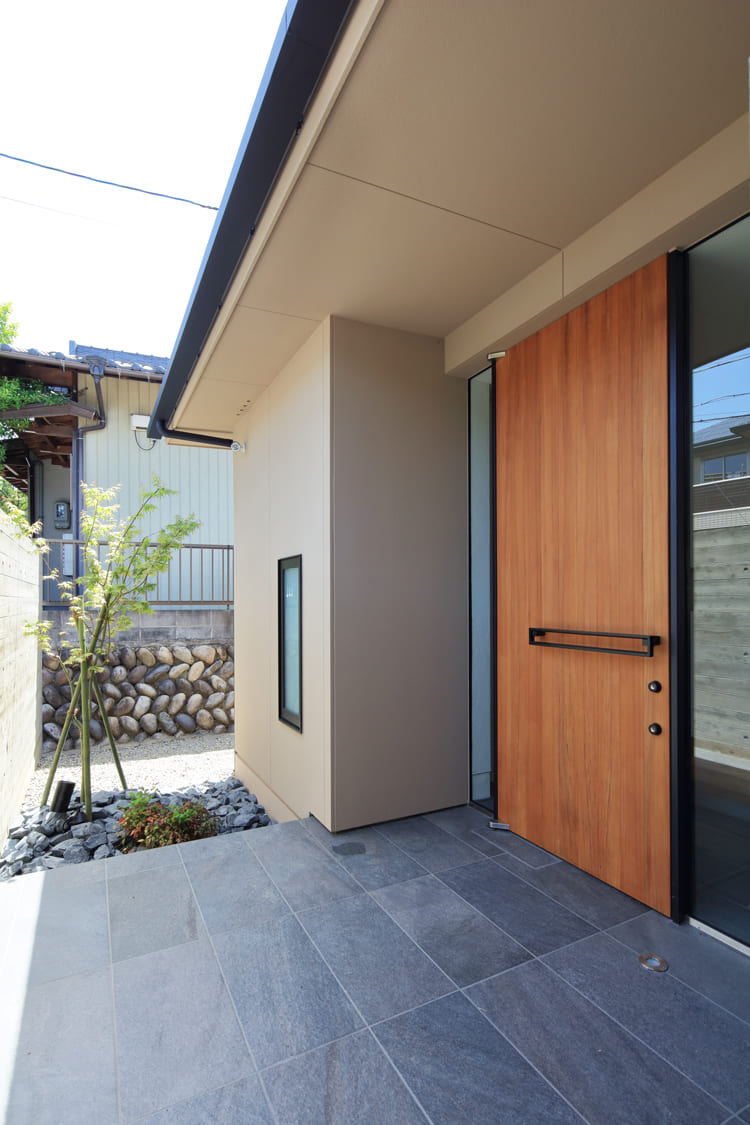 【玄関】内と外を、緩やかに繋ぐ。タイルと木のコントラストが美しい、迎賓の空間。