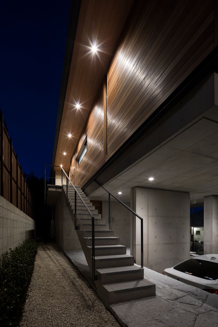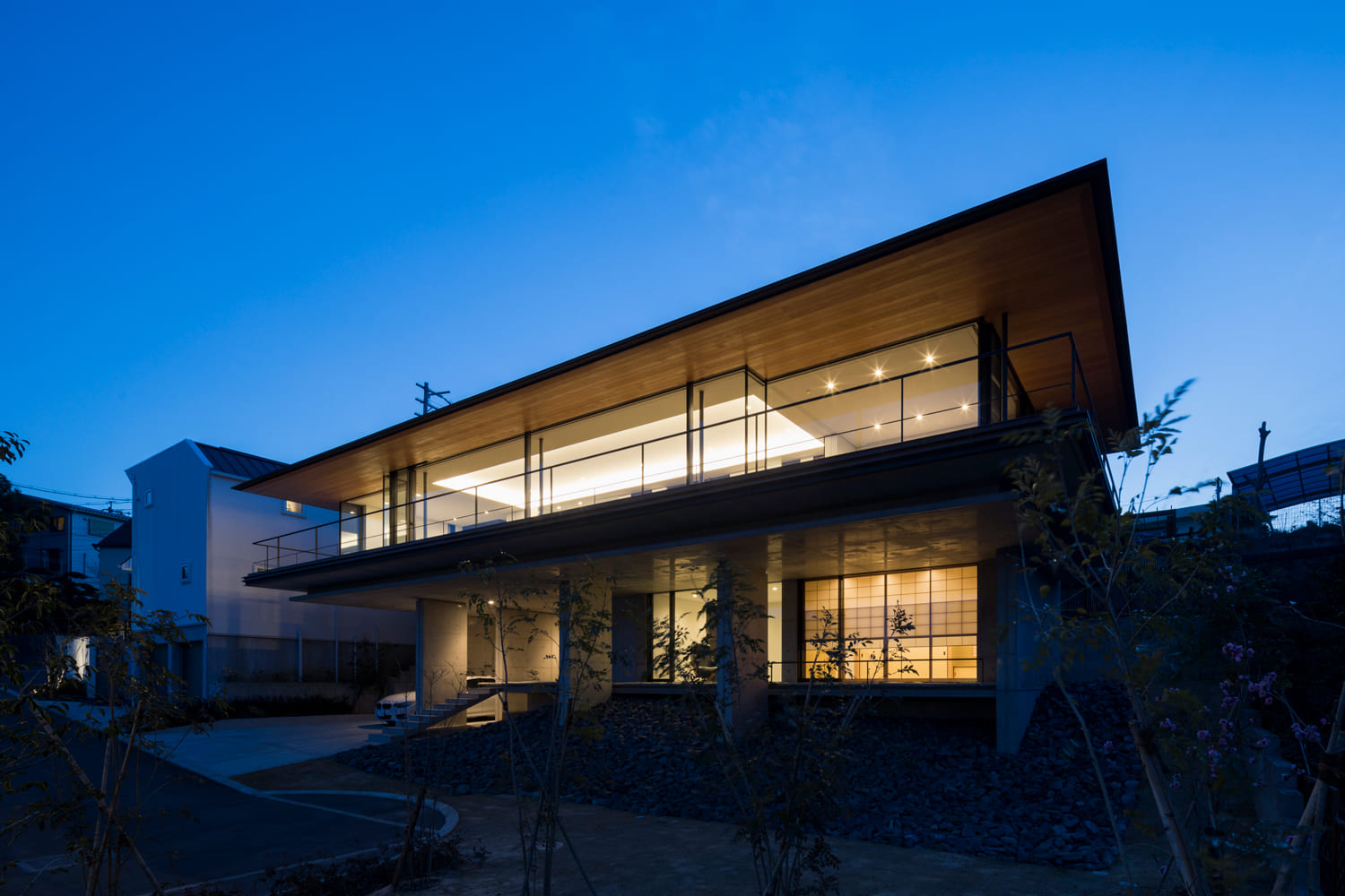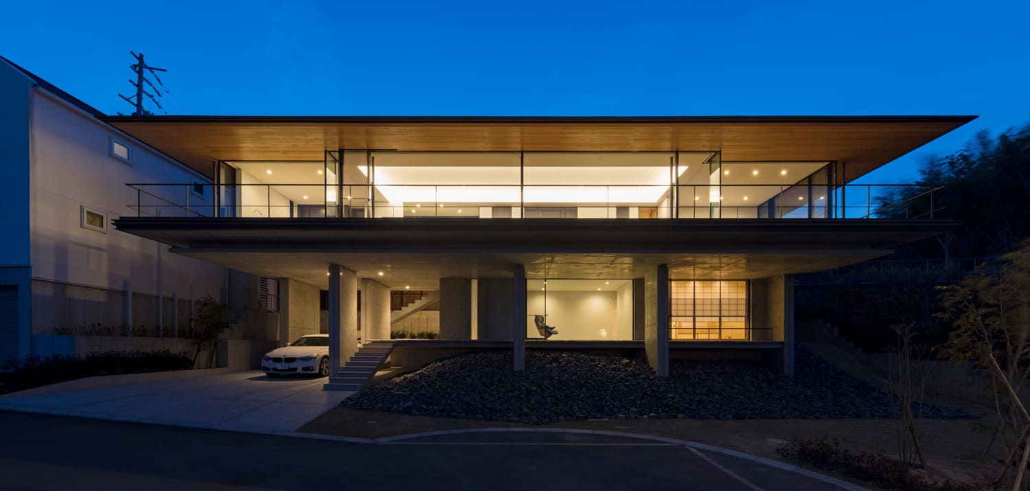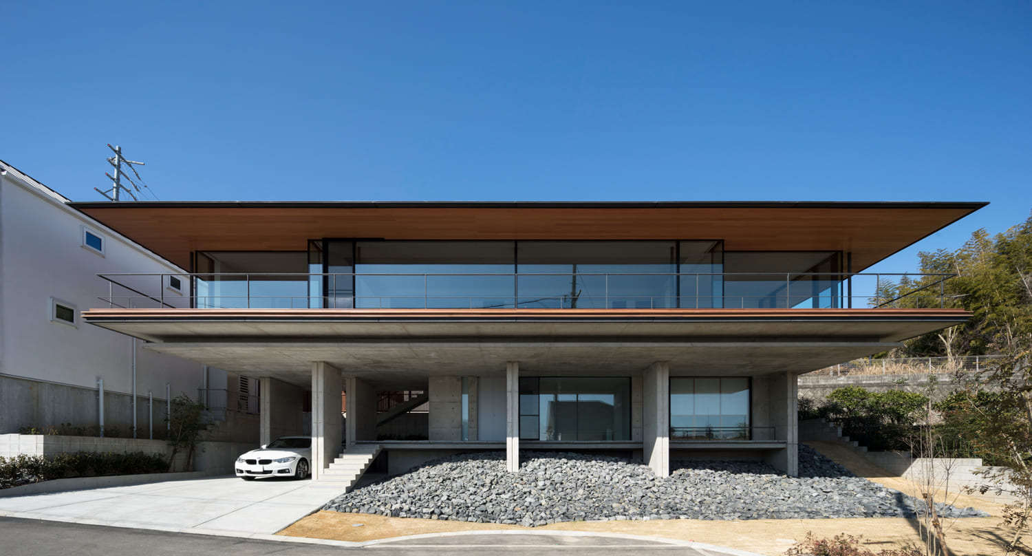 その上に、水平に伸びる美しい木目の軒と、ガラス張りの居住空間が、まるで宙に浮かぶように軽やかに乗っています。
