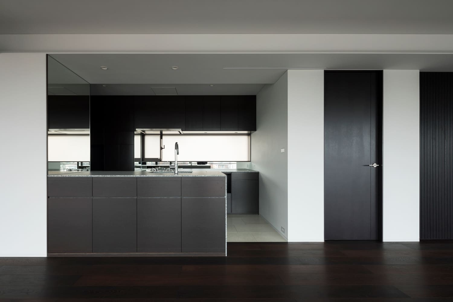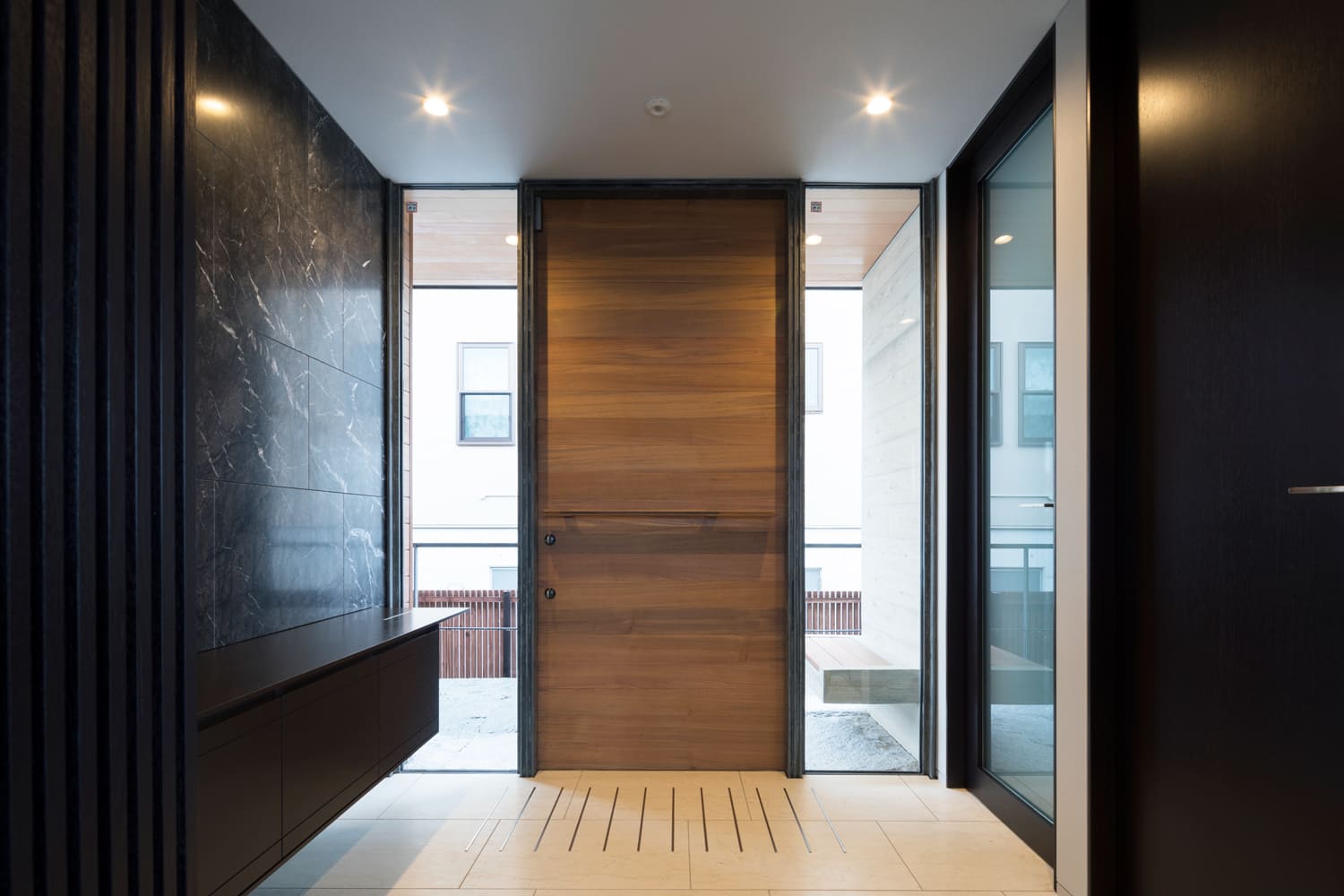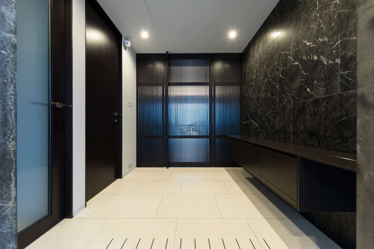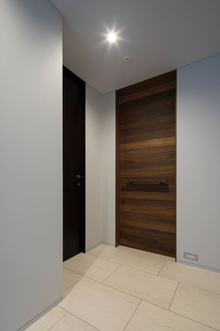 玄関から室内へと続く廊下は、壁にあしらわれた、大理石を思わせる重厚なパネルや、リズミカルな縦格子が、まるで美術館の回廊のような、上質な空間を演出します。