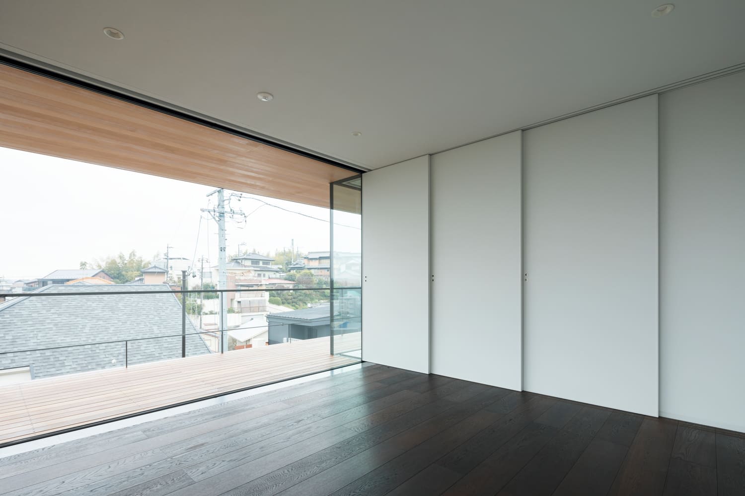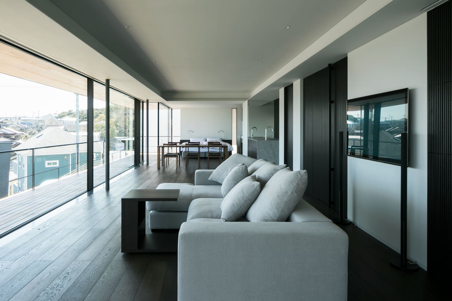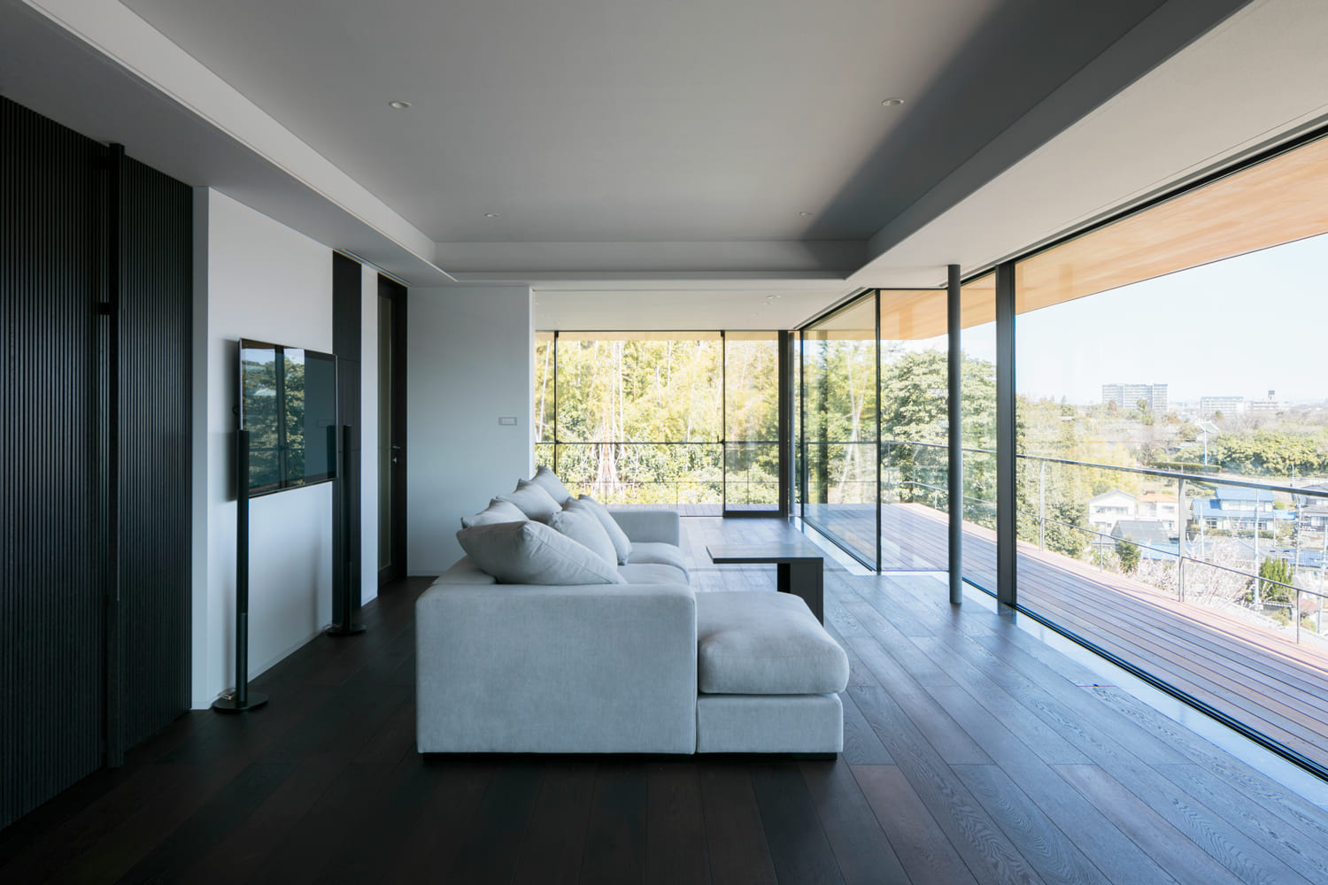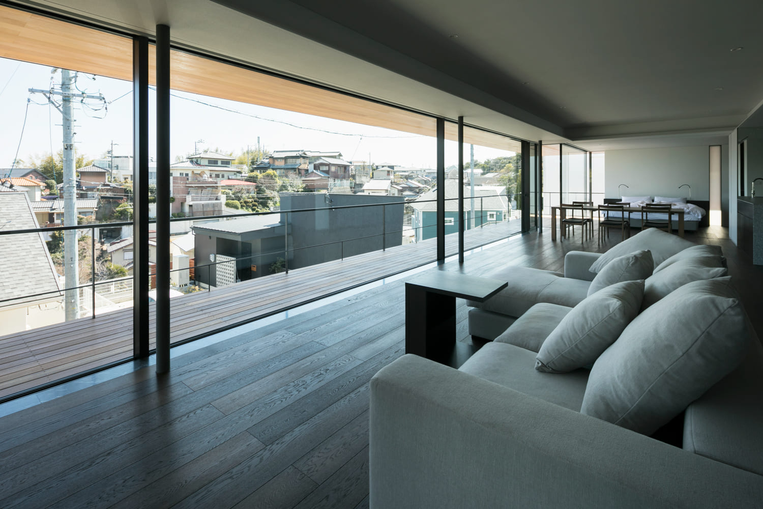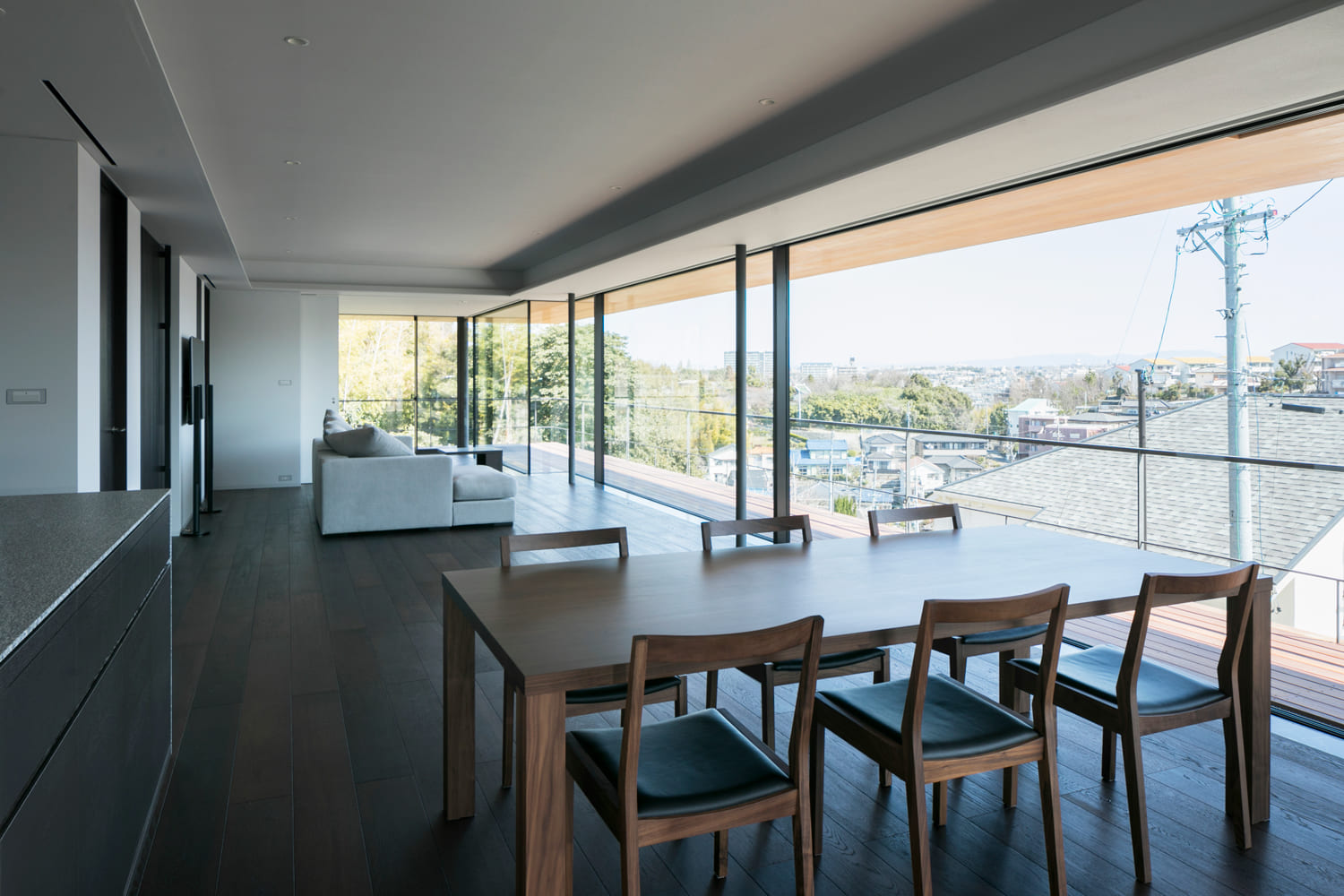 床から天井まで続くガラスの壁が、室内にいながらにして、まるで空と一体になったかのような、圧倒的な開放感をもたらします。