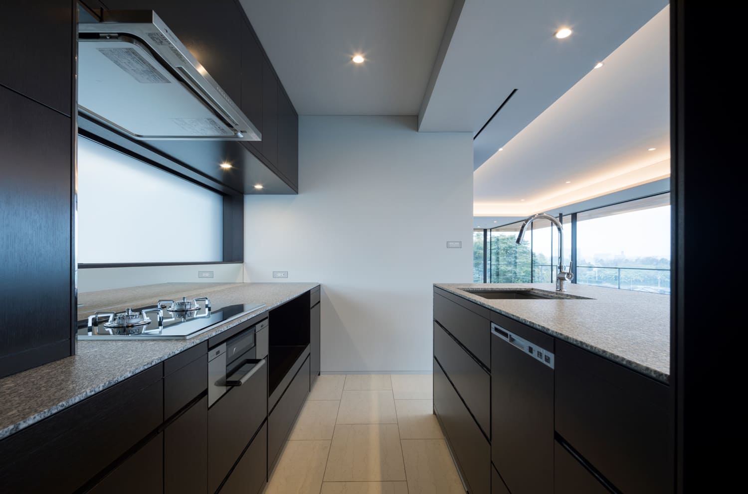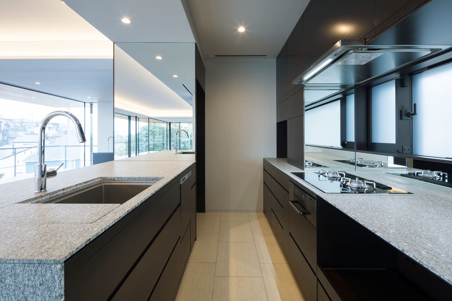 リビングダイニングの一角を占めるのは、重厚な御影石の天板と、ダークな木目が美しい、プロ仕様のキッチンです。