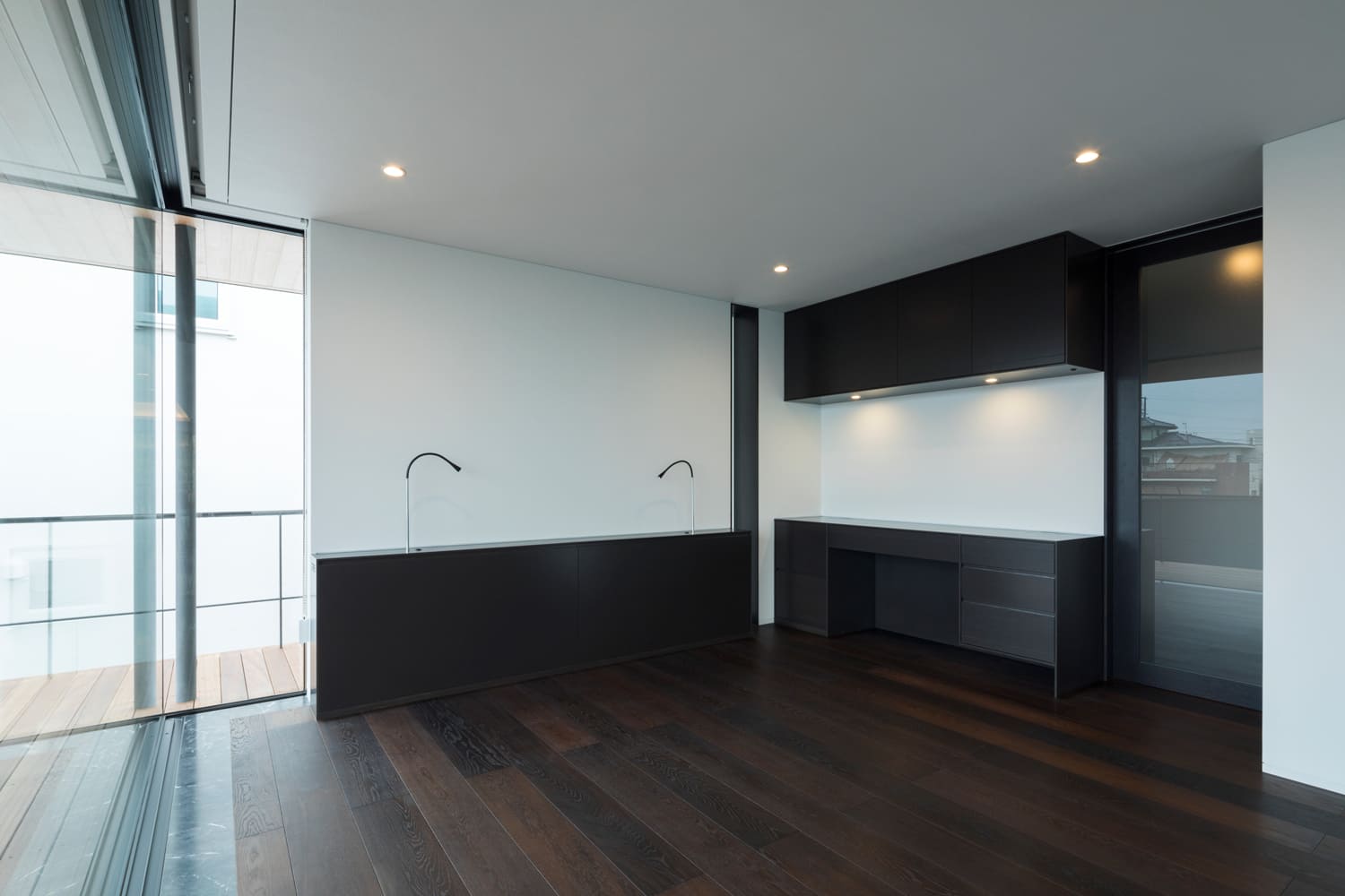 落ち着いた色調のダークな床材が、窓の外の景色を、より一層鮮やかに引き立てます。