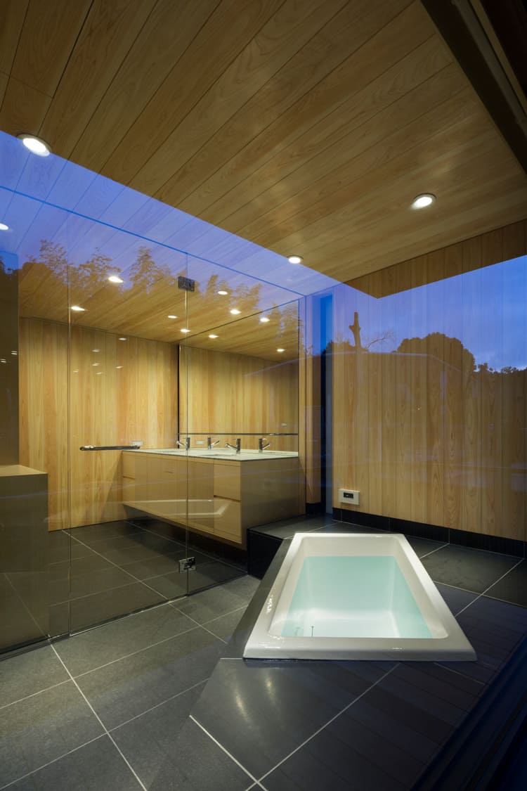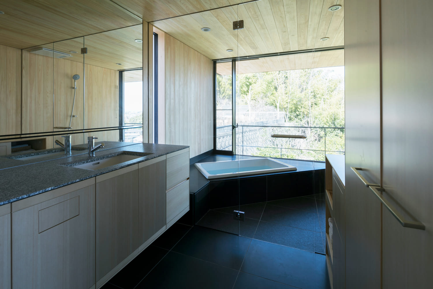 角に設けられたバスタブは、二面が床から天井までのガラス張りになっており、目の前には、借景の森が広がります。