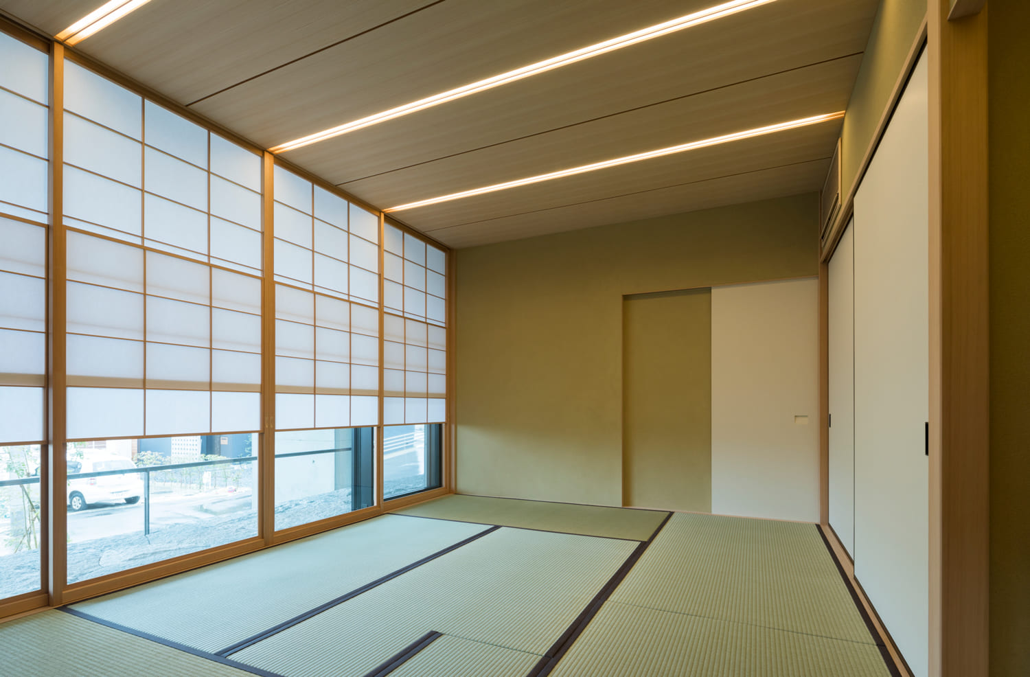 この邸宅には、リビングのモダンな雰囲気とは対照的な、静かで落ち着いた和室も用意されています。